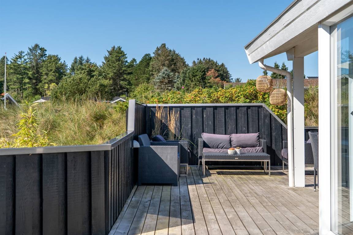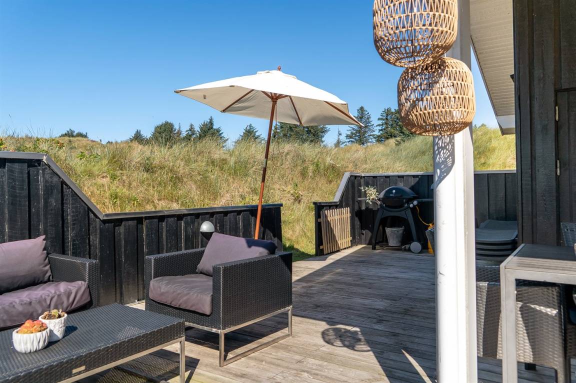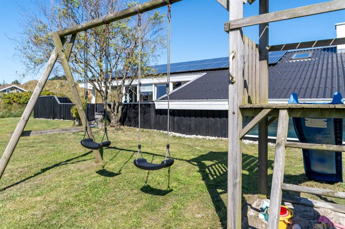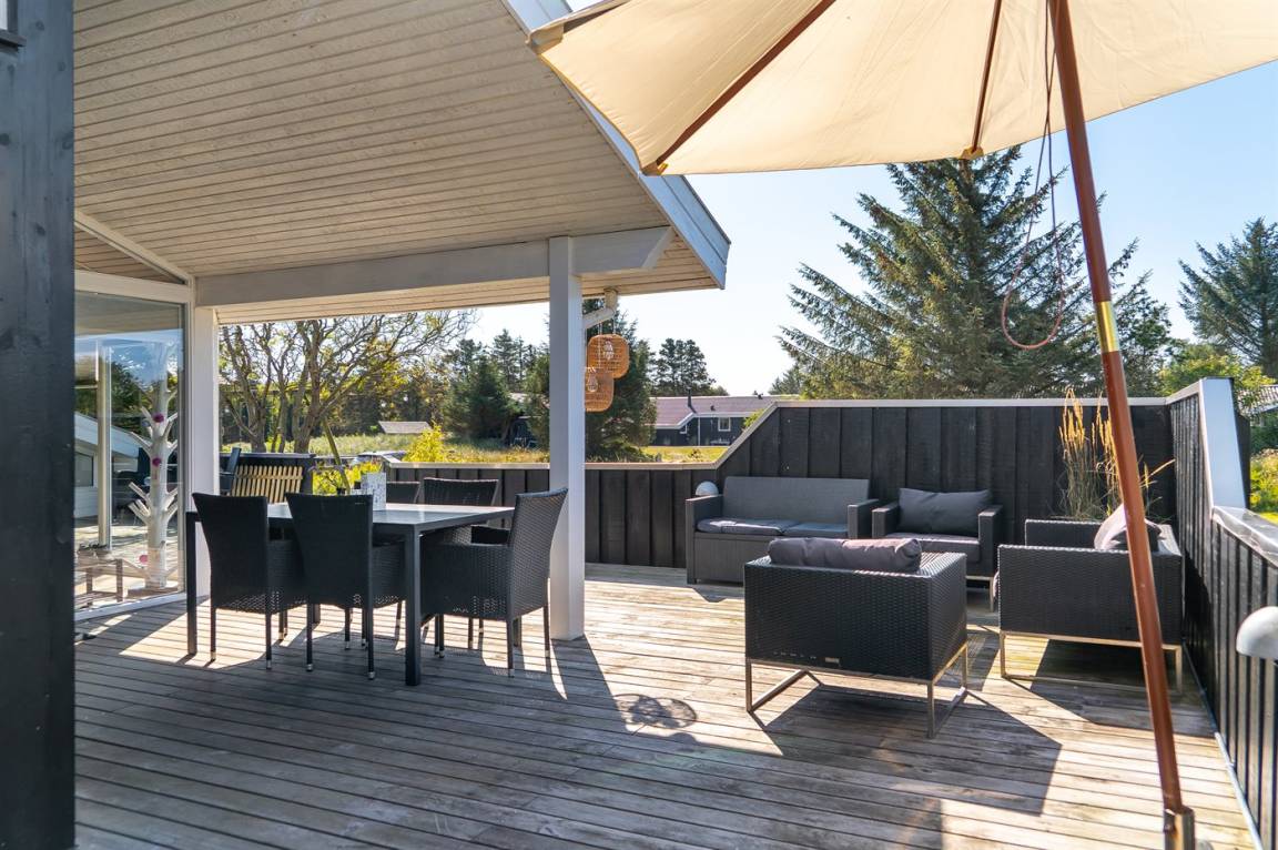 Draußen kannst du die langen Sommertage auf den schönen Terrassen des Hauses genießen – es gibt sowohl offene als auch eine überdachte Terrasse, sodass du bei jedem Wetter draußen sitzen kannst. Für die Kleinsten gibt es ein Spielgerüst im Garten, auf dem sie sich frei austoben können.