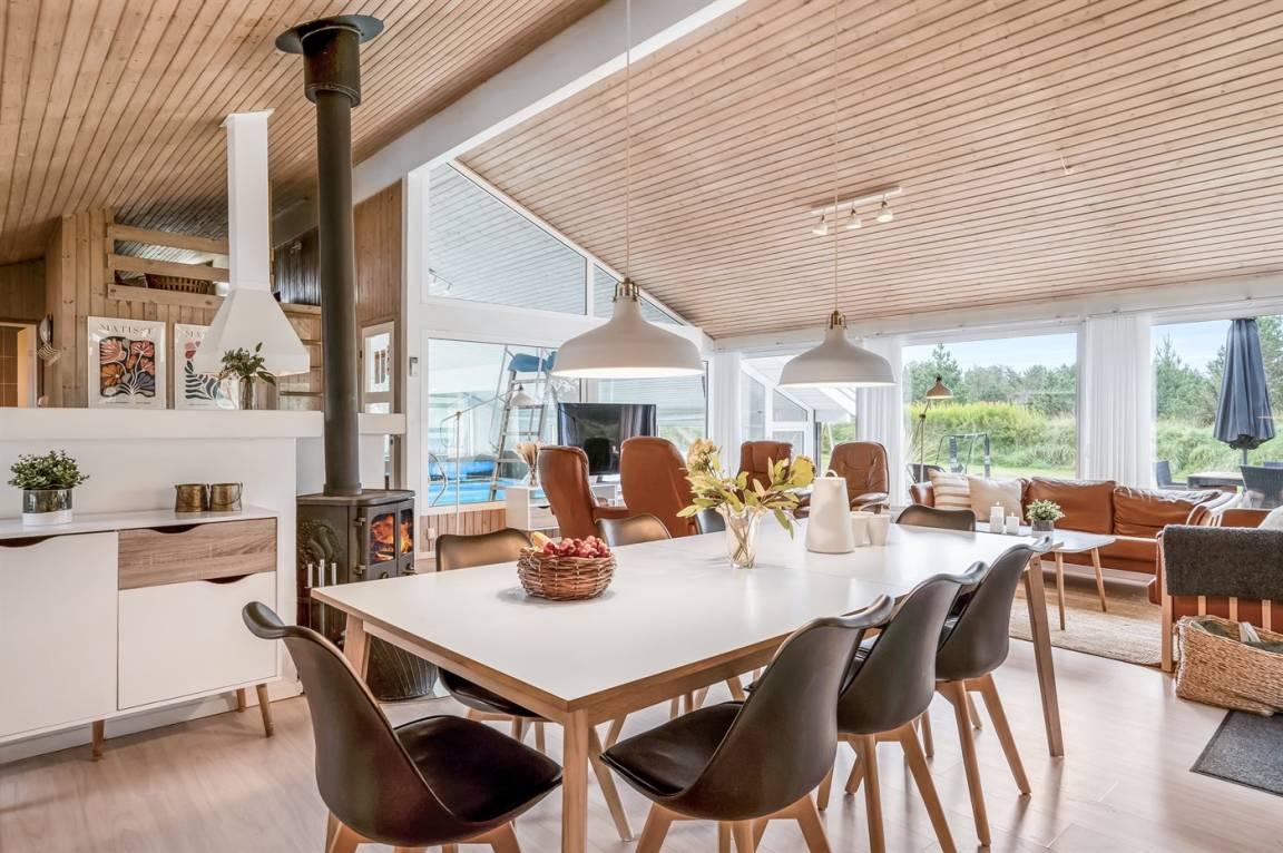 EinrichtungDas Ferienhaus eignet sich für 10 Personen sowie 1 Kleinkind bis zu 3 Jahren. 4 der Schlafplätze eignen sich jedoch nur für größere Kinder (4-11 Jahre). Die Ferienunterkunft hat eine Wohnfläche von 150 m² und wurde 1991 gebaut. 2017 wurde die Ferienunterkunft teilweise renoviert. Es ist erlaubt 1 Haustier mitzubringen. Die Ferienunterkunft ist mit energiesparender Wärmepumpe ausgestattet.Energiefreundliche Luft-Wasser-Wärmepumpe erwärmt das Wasser im Pool. Die Ferienunterkunft ist mit Waschmaschine ausgestattet. Wäschetrockner. Tiefkühlmöglichkeit mit 130 Liter Nutzinhalt. Es gibt außerdem einen Kaminofen. Für die jüngsten Feriengäste ist 1 Kinderhochstuhl vorhanden.