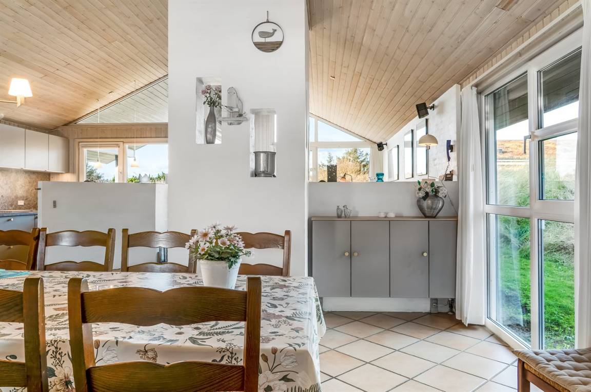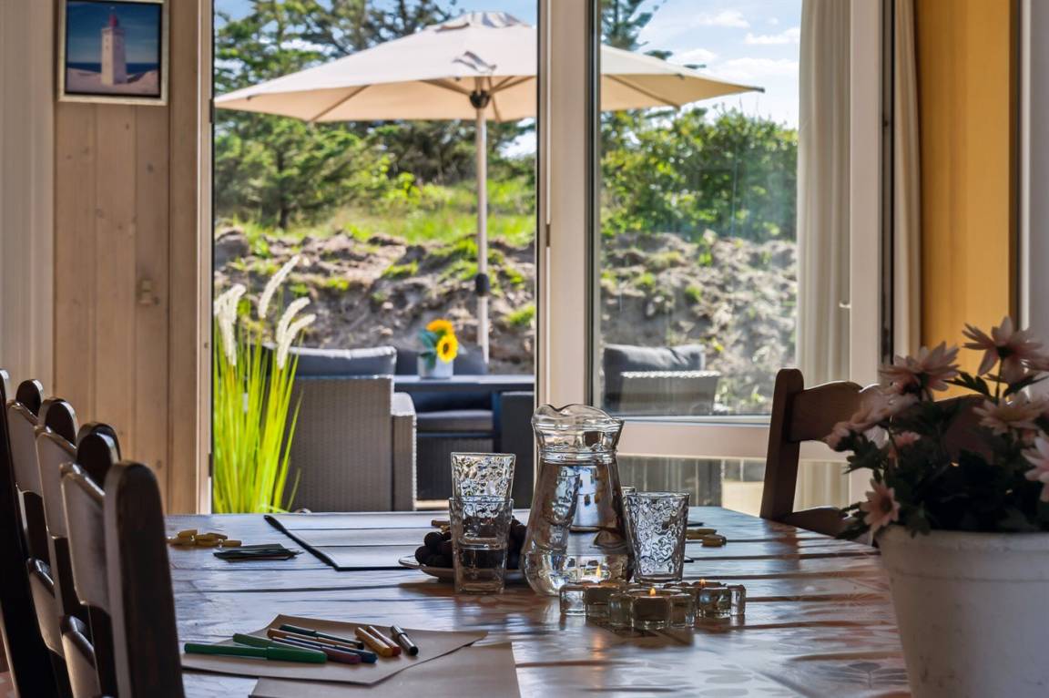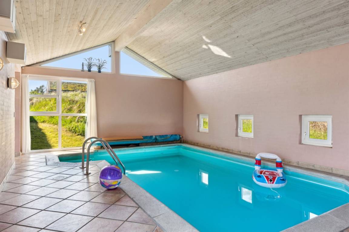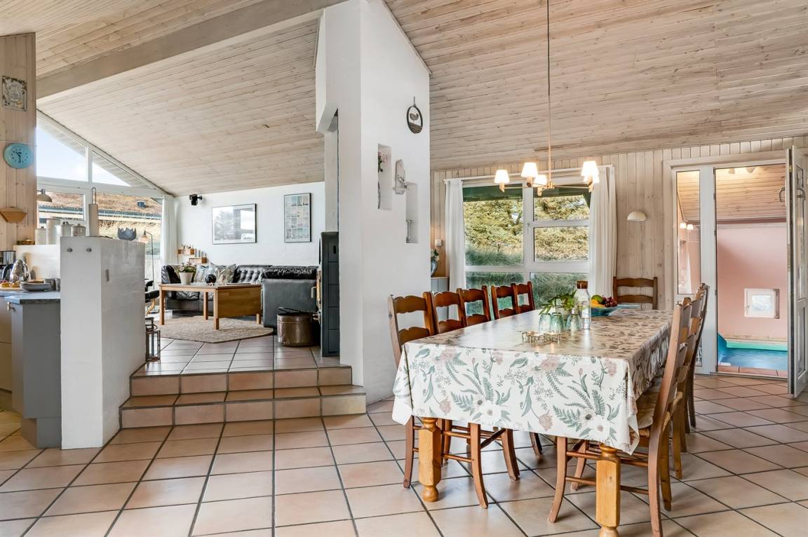 In ruhiger Umgebung finden Sie dieses attraktive und energiegerechte Ferienhaus, das aus giftfreien Materialien gebaut ist. Das Haus liegt nur 800 m von der schönen Nordsee, mit einem der besten und leicht zugänglichen Badestrände Dänemarks, entfernt. Der Mittelpunkt des Hauses ist die Poolabteilung. Schöner Essplatz, von dem Sie die Aktivitäten im Poolraum betrachten können. Im offenen Obergeschoss gibt es Fernseher (kein Antennenanschluss).