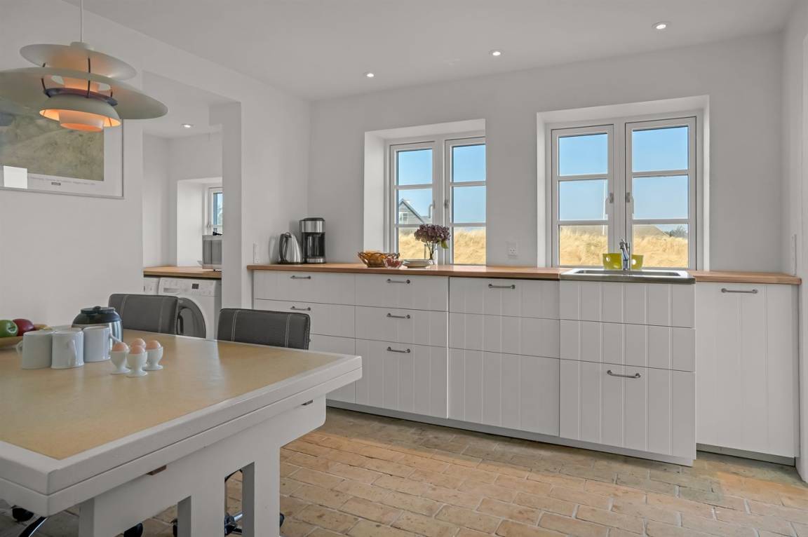 Die Einrichtung ist schlicht und funktional, und die großen Fenster lassen viel Licht und die Aussicht in die Wohnräume strömen. Hier kannst du dir leicht lange, ruhige Ferientage mit Büchern, Brettspielen und Entspannung nach einem Bad in den Wellen vorstellen.