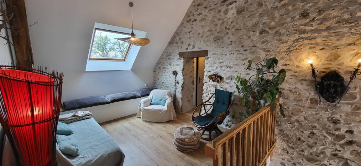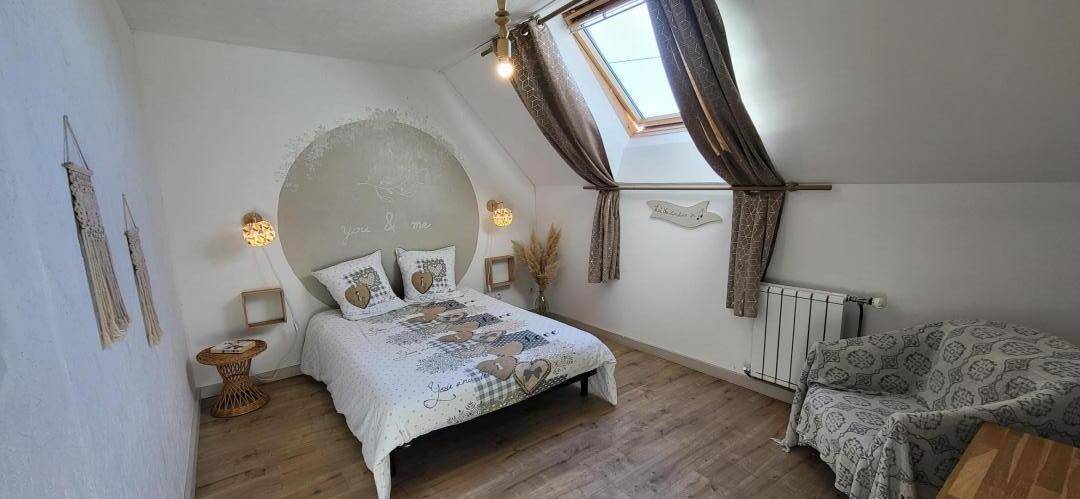 In einer alten Scheune aus Stein untergebracht, strahlt das große Wohnzimmer mit gepflegter Dekoration Geselligkeit aus. Sie werden den Essbereich mit offener Küche und zentraler Kochinsel genießen. In der Saison finden Sie sich im Wohnzimmer am Kamin wieder. Auf der Terrassenseite können Sie die umliegende Natur bewundern: Täler, gesicherter Teich, Wege. Die Eigentümer des angrenzenden Hauses beraten Sie gerne zu Besichtigungen oder Wanderungen. Ein Spielplatz steht Ihnen zur Verfügung (Rutsche, Schaukel, ...) Sie genießen auch ein oberirdisches Schwimmbad. Elektroheizung und Pelletofen. Erdgeschoss: Küche offen zum Wohnzimmer, 1 Badezimmer (Dusche) und 1 separates WC. Obergeschoss: 1 Familienschlafzimmer für 2 Personen (1 Bett 140 x 190 cm), 1 Schlafzimmer ohne Fenster für 3 Personen (2 Betten 90 x 190 cm) und 1 Bett 2 m hoch aufgehängt (90 x 190 cm, geeignet für Kinder ab 12 Jahren). alt), 1 Familiensuite bestehend aus einem Schlafzimmer für 2 Personen (140 x 190 cm) und durch eine