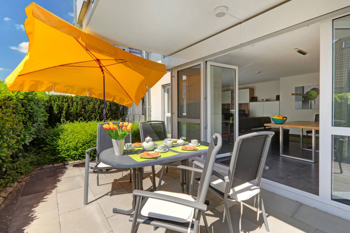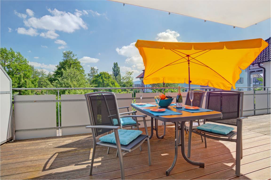 Vom Wohn-Essbereich aus erreichen Sie die nach Süden ausgerichtete großzügige Terrasse (ca. 15 qm). Genießen Sie hier einen Blick auf die Ruine Alt-Bodman, sonnig bis zum späten Abend vielleicht bei eine Glas Rotwein. Von den beiden Schlafzimmern aus erreichen Sie außerdem den angrenzenden Hochparterre-Balkon (>20qm). Den Blick ans Bodenseeufer trennt nur eine Baumreihe. Ideal zum Frühstück mit der Morgensonne.