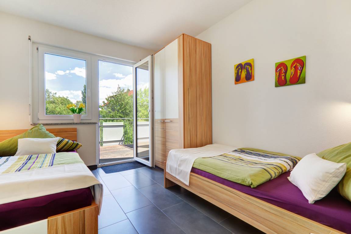 In zwei komfortablen Einzelbetten (90x180) finden Sie hier angenehmen Schlaf. Außerdem: Kleiderschrank, Fenster mit Insektenschutzgitter und Tür zum großen Hochparterre-Balkon, jeweils LED-Leselampe, Kinderbücher und einen CD-Spieler.