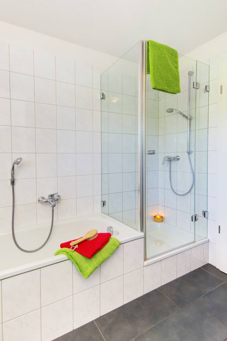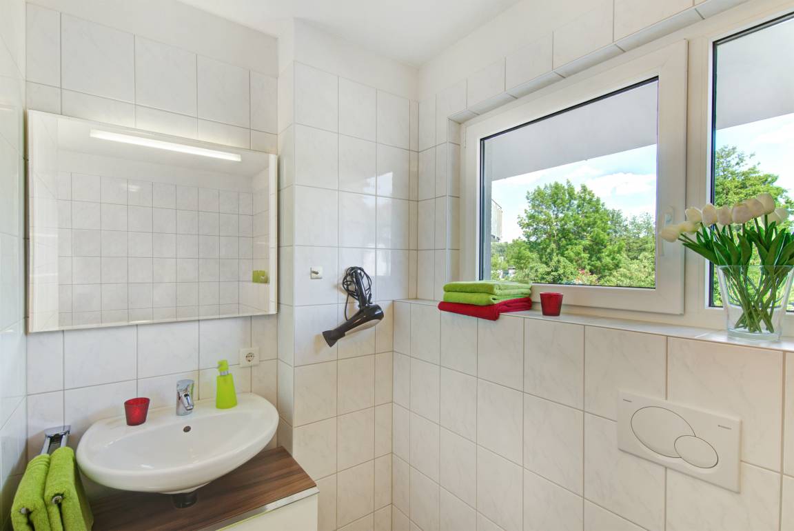 Das moderne Tageslichtbad verfügt über eine Badewanne, separate Dusche (90x90) und WC. Es steht Ihnen ein weiteres separates Gäste-WC und Abstellraum mit Hauswirtschaftsutensilien zu Verfügung. Im Keller der Anlage können Sie Ihre Wäsche gegen Gebühr waschen und trocknen.