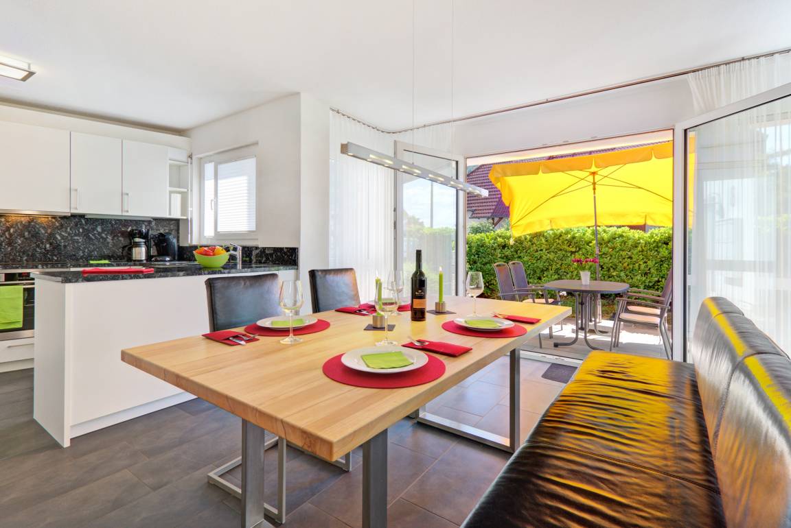 Im hellen Wohnzimmer finden Sie eine gemütliche Couchgarnitur, 3 bequeme Freischwinger-Lederstühle und eine Lederbank mit Rückenlehne. und den Medienbereich mit TV, DVD-Player, Hifi-Anlage, Spielesammlung und Bücherauswahl. Im gesamten Feriendomizil beziehen Sie Gratis-WLan. Der offene Essbereich mit Blick auf Terrasse lädt ein für gesellige Stunden.