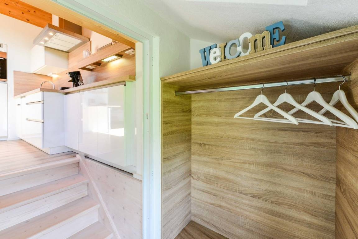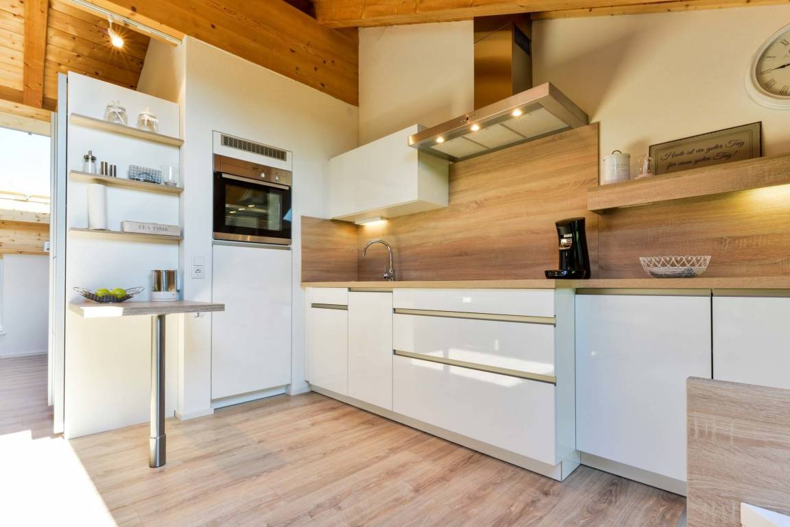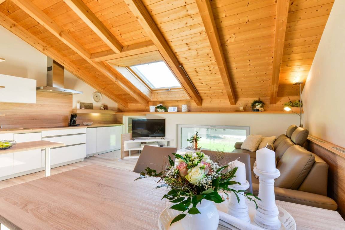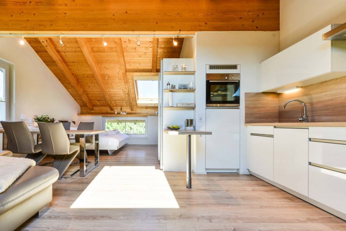 Gelegen im Obergeschoss des Nebengebäudes bieten die Wohnungen einen großartigen Ausblick. Die idyllische Stimmung zwischen Wald und See bietet einzigartige Ruhe und Erholung. Die geschmackvoll gestaltete Ferienwohnung 2 verfügt über einen stilvoll kombinierten Wohn- und Essbereich. Die Wohnfläche besticht mit einer großen, einladenden Couch. Der Esstisch mit lädt zum gemeinsamen Speisen ein. Der moderne Küchenbereich bietet eine freistehende Kochinsel. Ideal zum Zubereiten von Speisen und Snacks.