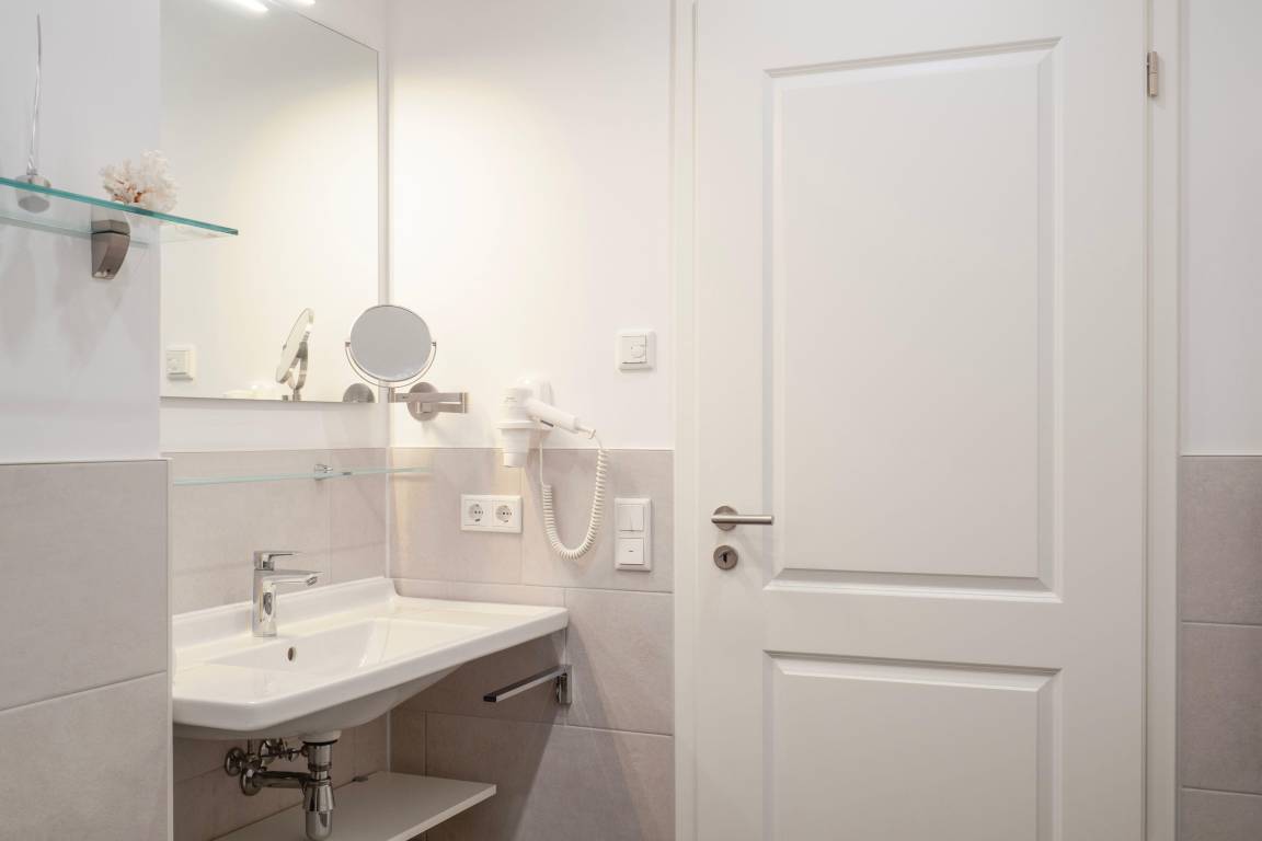 Im geräumigen Bad befinden sich eine großzügige, ebenerdige Regendusche, ein Handtuchtrockner, ein Waschtisch mit Föhn und Kosmetikspiegel.