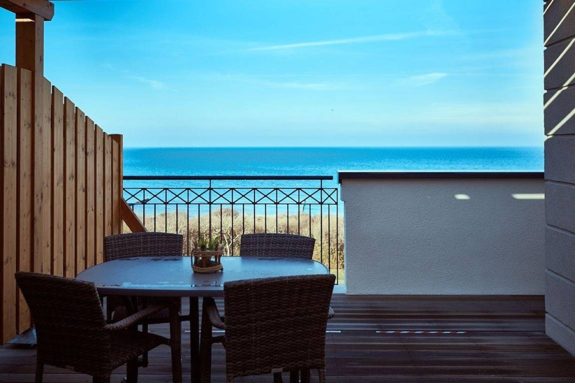 Auf der Dachterrasse, die zur Meerseite gelegen ist, stehen Ihnen Terrassenmöbel zur Verfügung. Hier können Sie mit Blick auf die Ostsee entspannen.