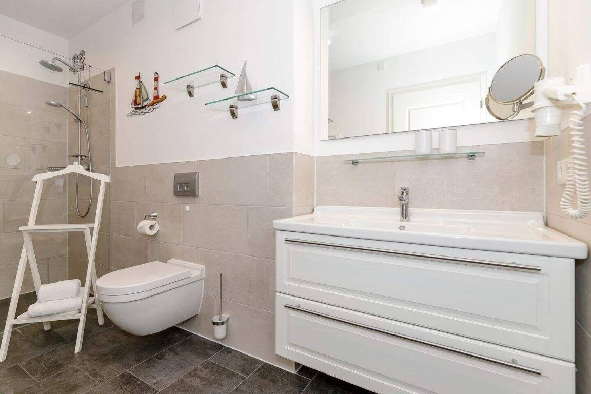 Im geräumigen Bad befinden sich eine großzügige, ebenerdige Regendusche, ein Handtuchtrockner, ein Waschtisch mit Föhn und Kosmetikspiegel.
