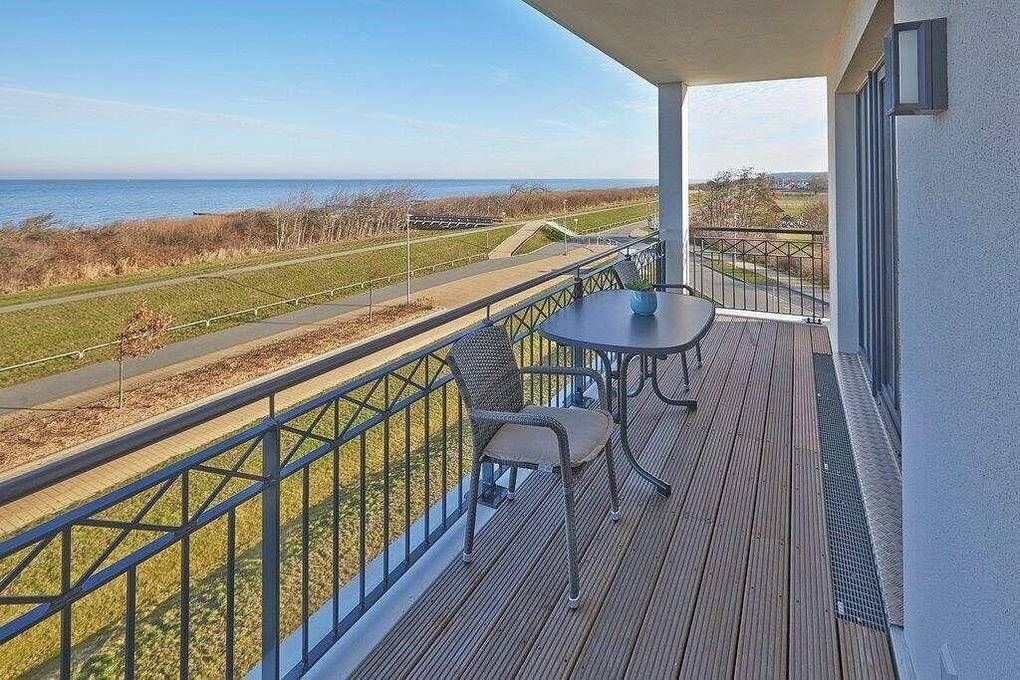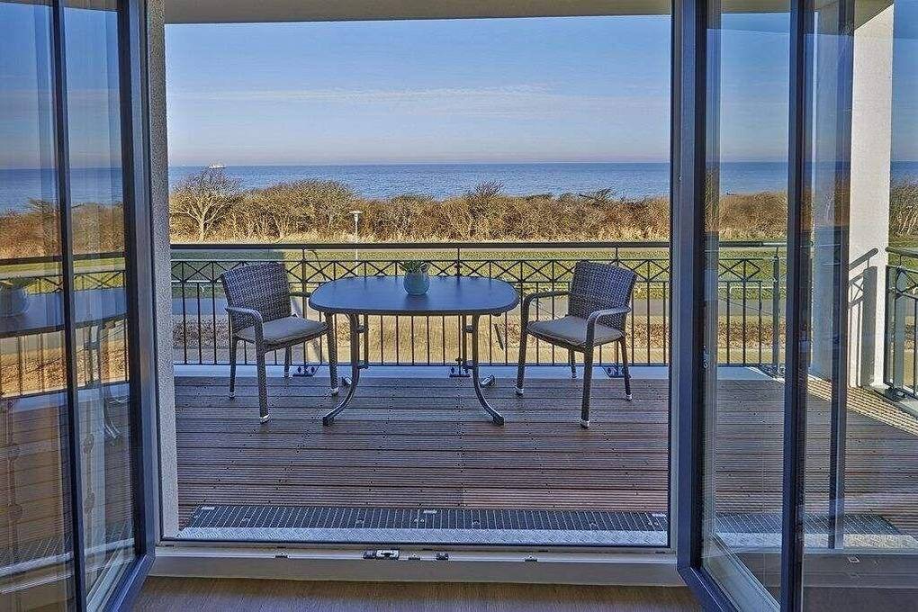 Auf dem überdachten Balkon, der zur Meerseite gelegen ist, stehen Ihnen Terrassenmöbel zur Verfügung. Hier können Sie mit Blick auf die Ostsee entspannen.