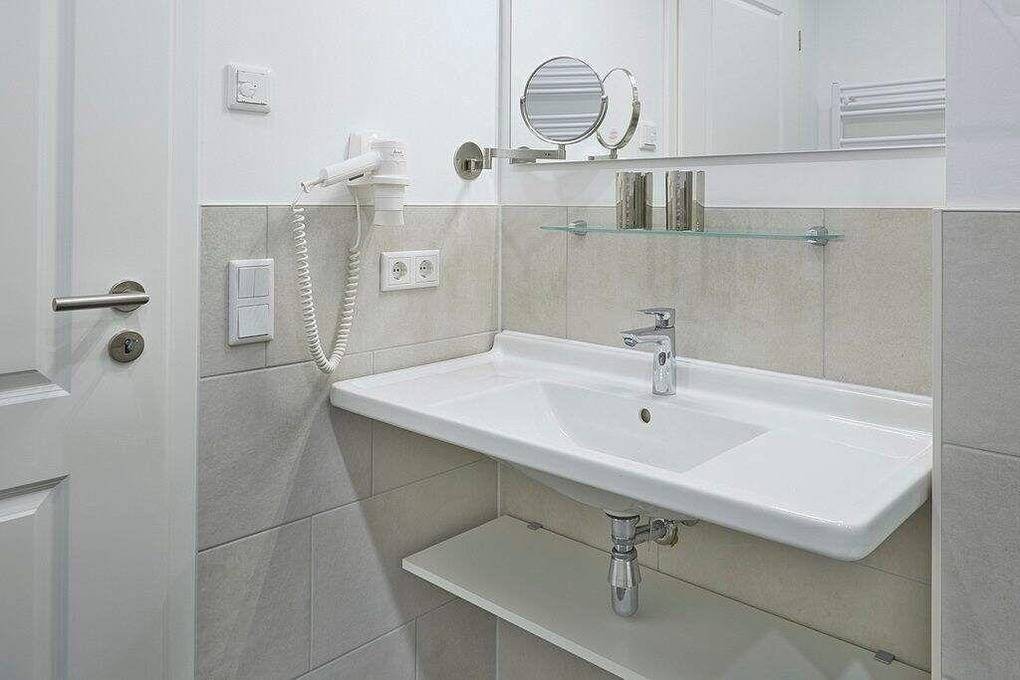 Im geräumigen Bad befinden sich eine großzügige, ebenerdige Regendusche, ein Handtuchtrockner, ein Waschtisch mit Föhn und Kosmetikspiegel.