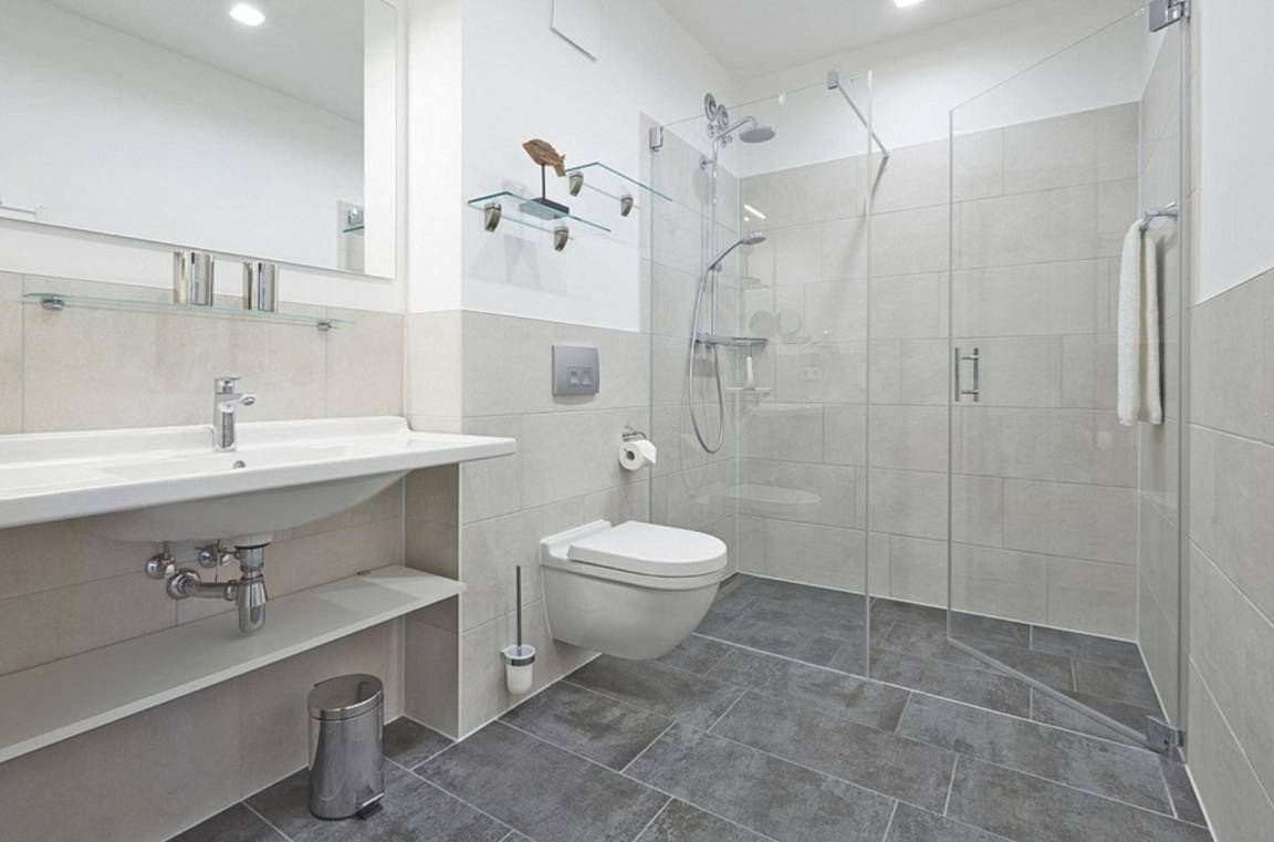 Im geräumigen Bad befinden sich eine großzügige, ebenerdige Regendusche, ein Handtuchtrockner, ein Waschtisch mit Föhn und Kosmetikspiegel.