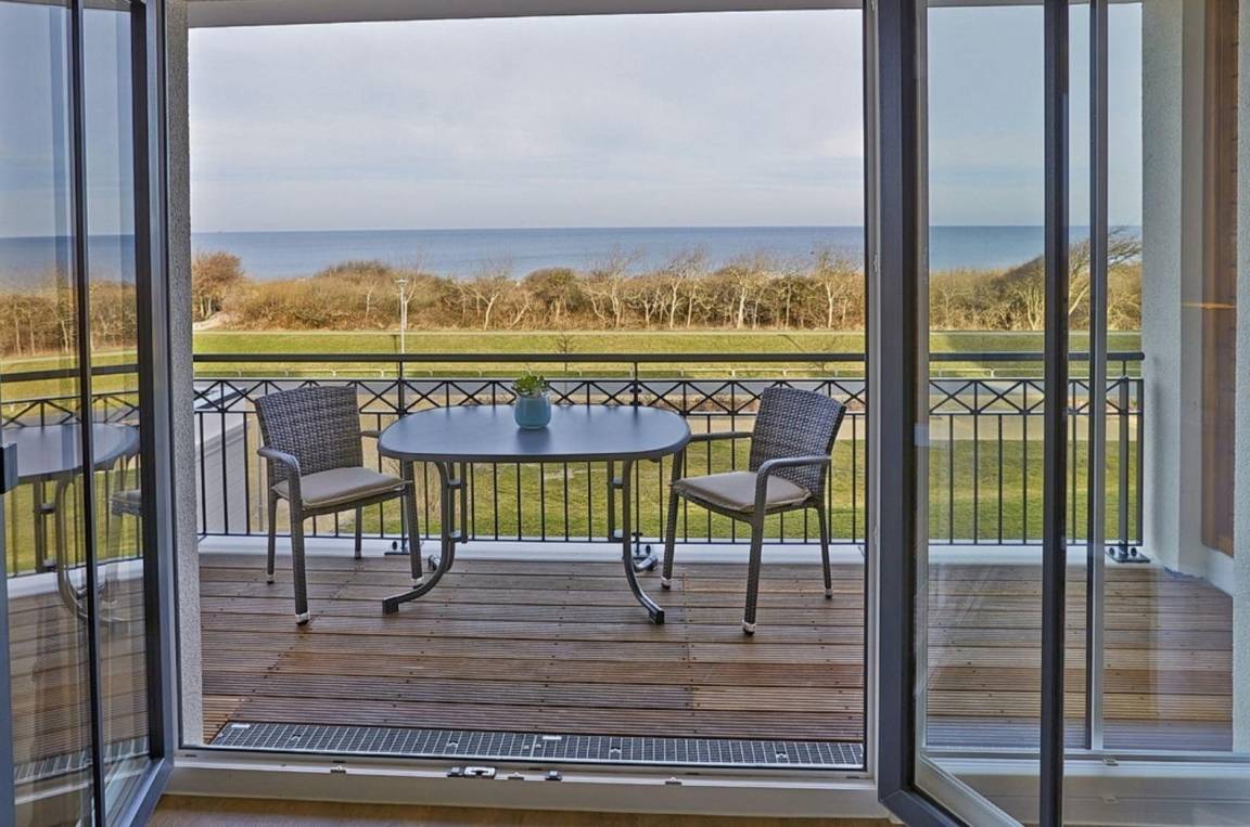 Auf dem überdachten Balkon, der zur Meerseite gelegen ist, stehen Ihnen Terrassenmöbel zur Verfügung. Hier können Sie mit Blick auf die Ostsee entspannen.