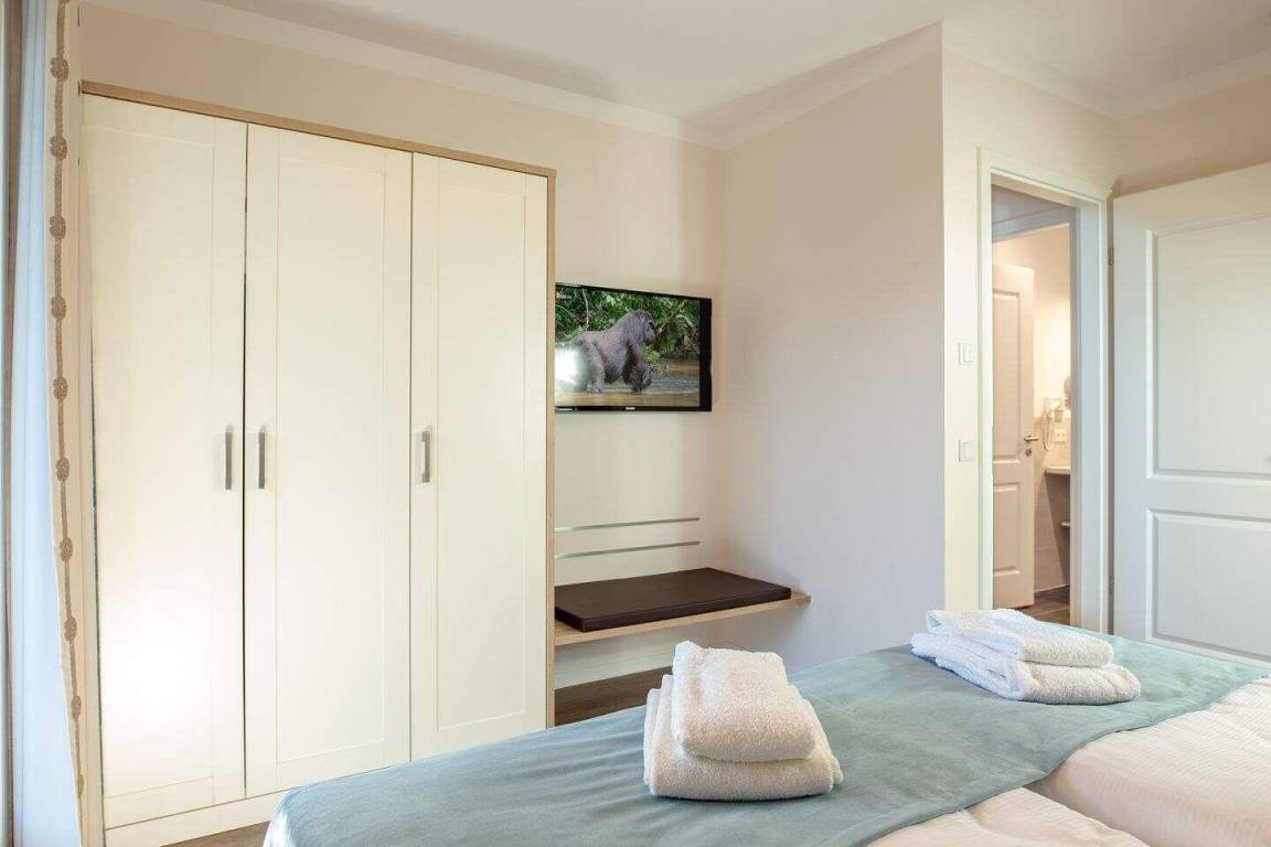 Das separate Schlafzimmer ist mit einem modernen Boxspringbett (180cm x 210cm), einem Flat Screen-TV und einem Safe ausgestattet. Der geräumige Kleiderschrank bietet genügend Platz für die mitgebrachte Urlaubsgarderobe.