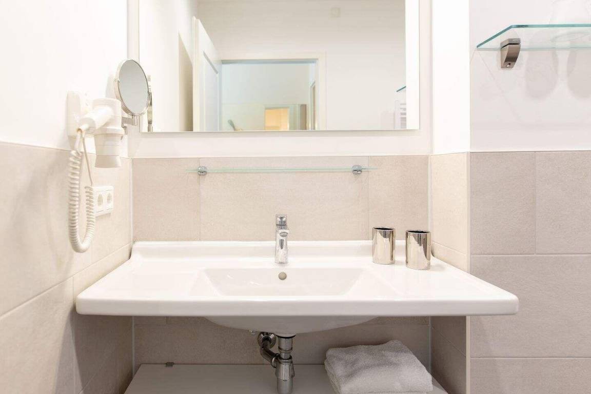 Im geräumigen Bad befinden sich eine großzügige, ebenerdige Regendusche, ein Handtuchtrockner, ein Waschtisch mit Föhn und Kosmetikspiegel.