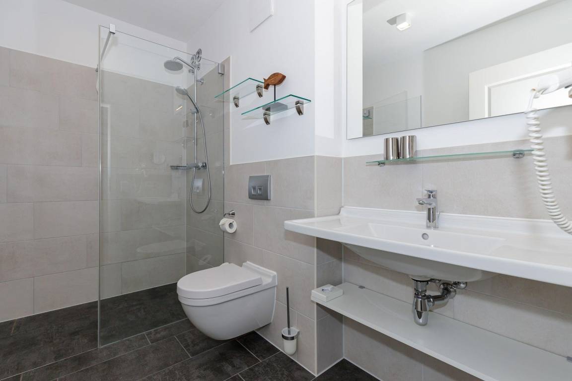Im geräumigen Bad befinden sich eine großzügige, ebenerdige Regendusche, ein Handtuchtrockner, ein Waschtisch mit Föhn und Kosmetikspiegel.