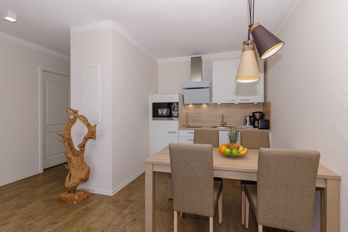 Im kombinierten Wohn-Essbereich befindet sich eine voll ausgestattete Küchenzeile, bequeme Sitzmöbel, ein Esstisch, eine Schlafcouch (140cm x 200cm) sowie ein Flat Screen-TV.
