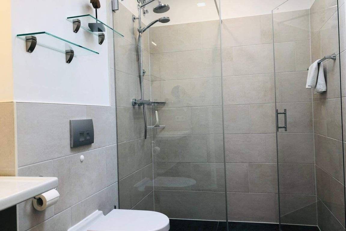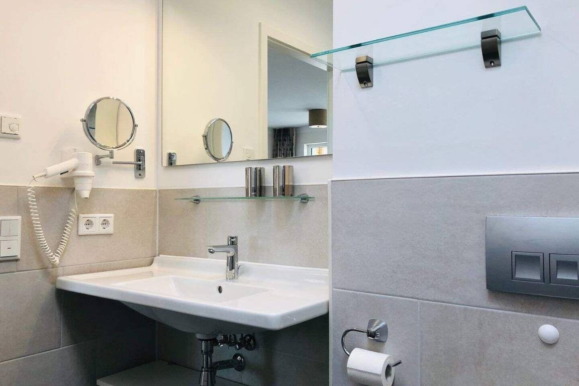 Im geräumigen Bad befinden sich eine großzügige, ebenerdige Regendusche, ein Handtuchtrockner, ein Waschtisch mit Föhn und Kosmetikspiegel.