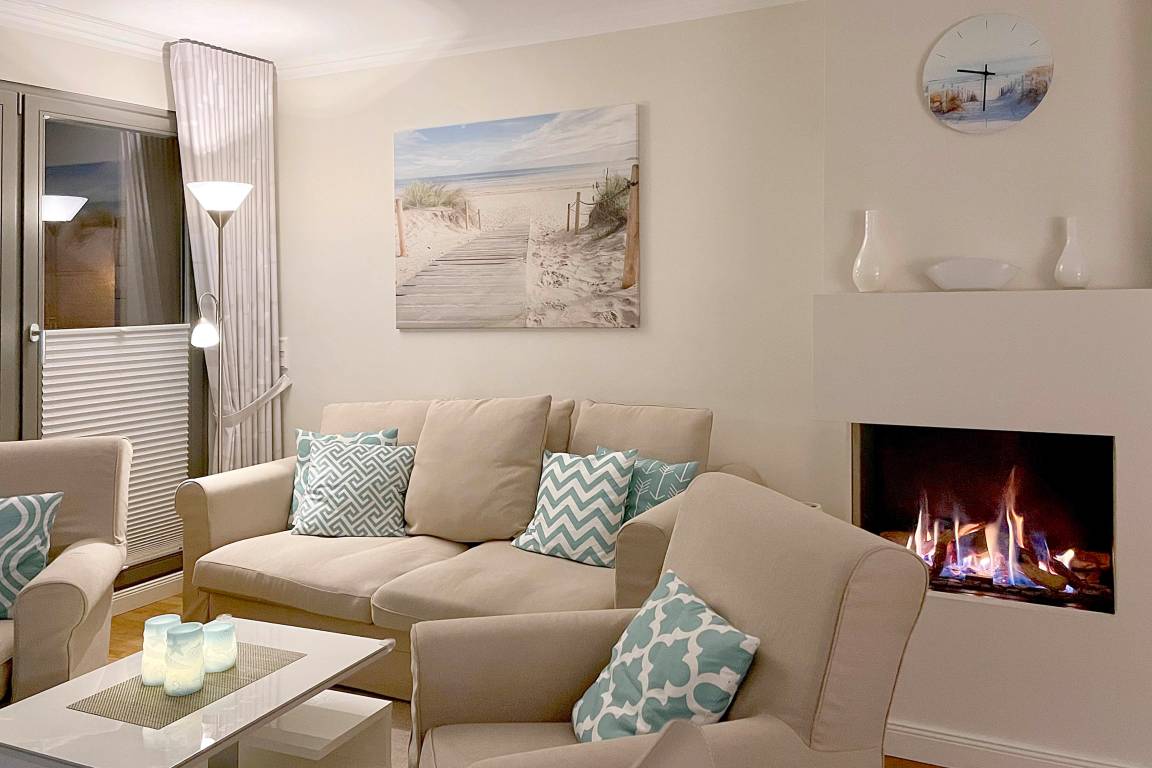 Im Wohnzimmer eine bequeme Couchgarnitur, ein geschlossener Kamin, der auch super funktioniert, ein TV-Board und ein grosser OLED-Fernseher.
