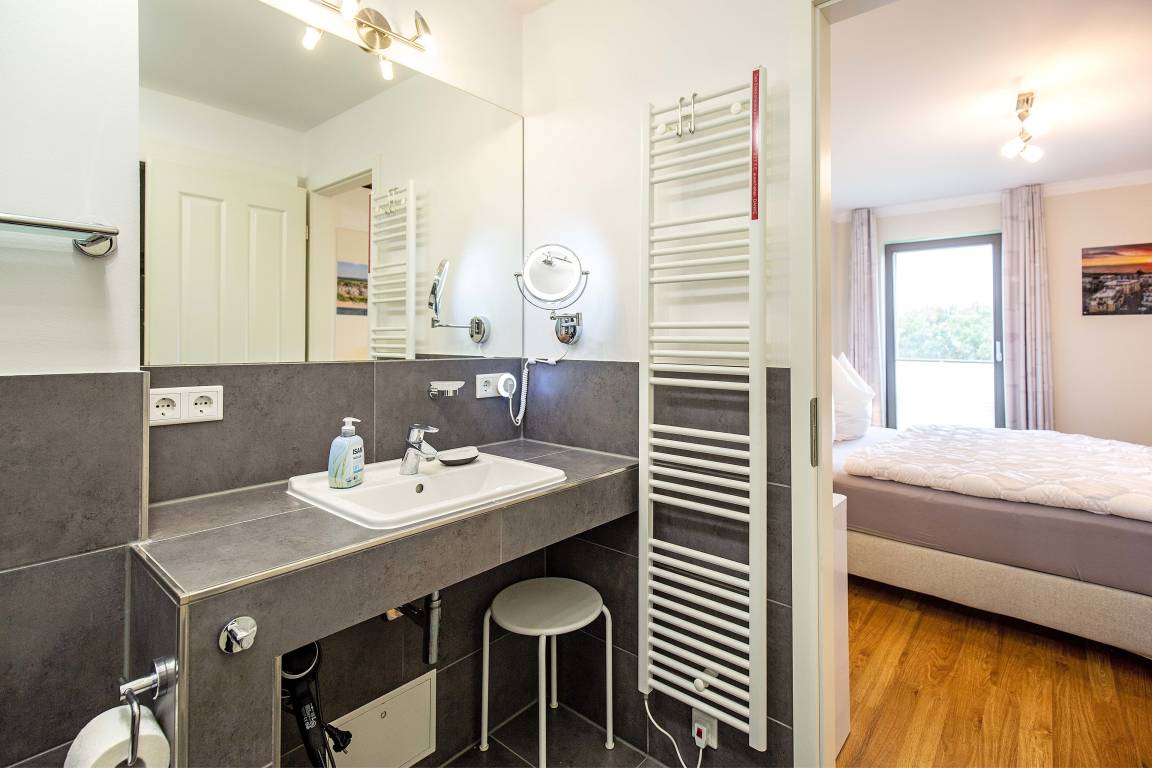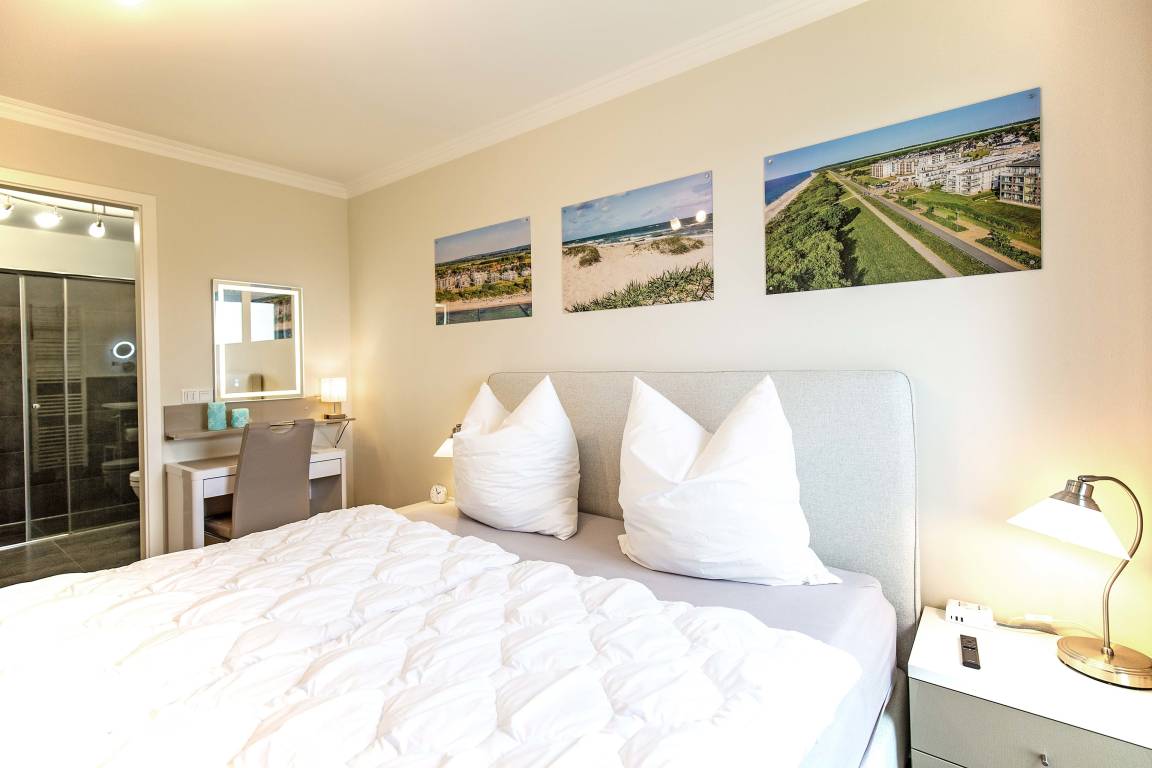 Zwei Schlafzimmer mit modernen Boxspringbetten und zwei komfortable Bäder.