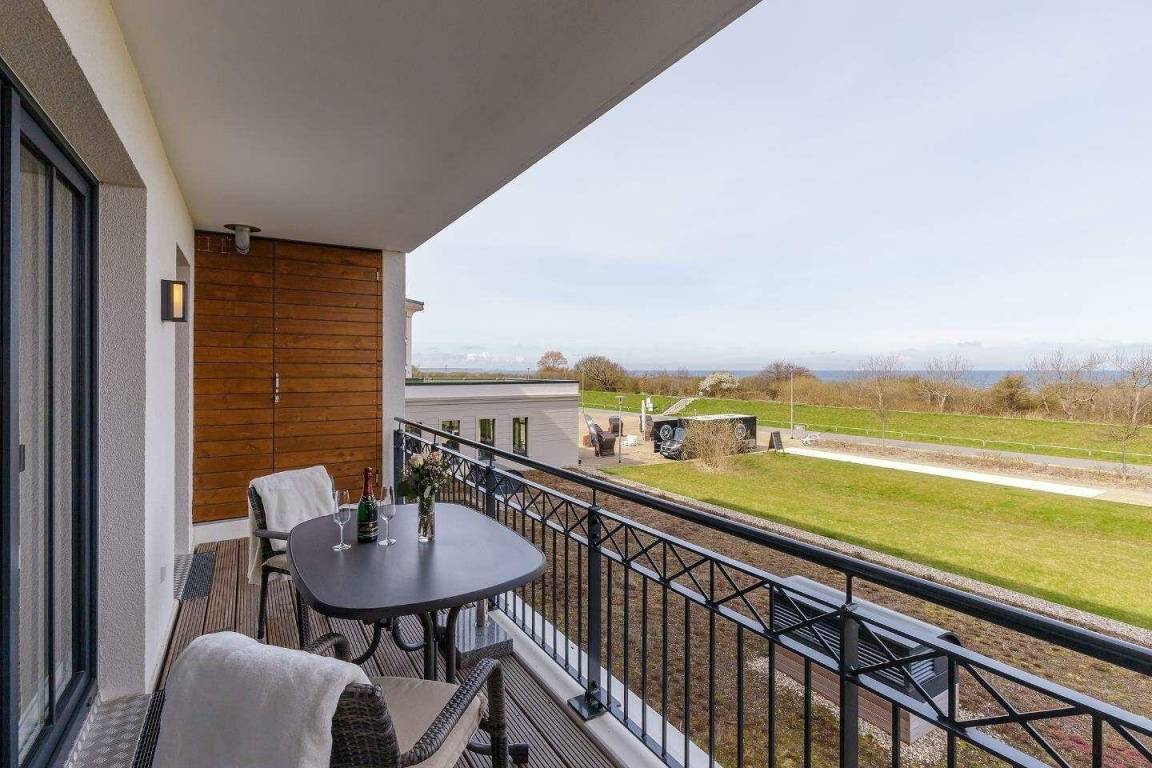 Auf dem überdachten Balkon, der zur Meerseite gelegen ist, stehen Ihnen Terrassenmöbel zur Verfügung. Hier können Sie mit teilweisem Blick auf die Ostsee entspannen.
