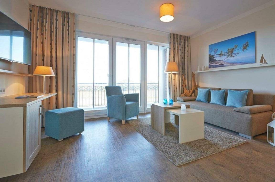 Die 49 m² große 2-Zimmer Suite ist für max. 4 Personen geeignet und befindet sich in nördlicher Lage mit Blick auf die Strandpromenade.