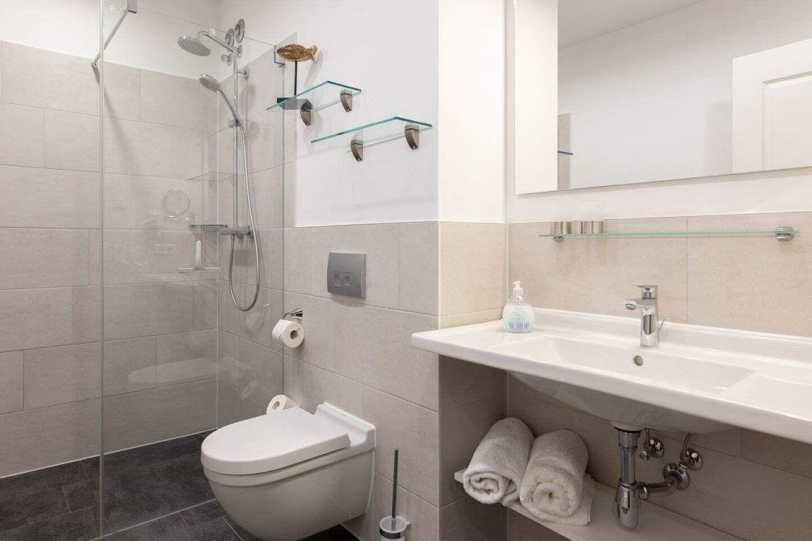 Im geräumigen Bad befinden sich eine großzügige, ebenerdige Regendusche, ein Handtuchtrockner, ein Waschtisch mit Föhn und Kosmetikspiegel.