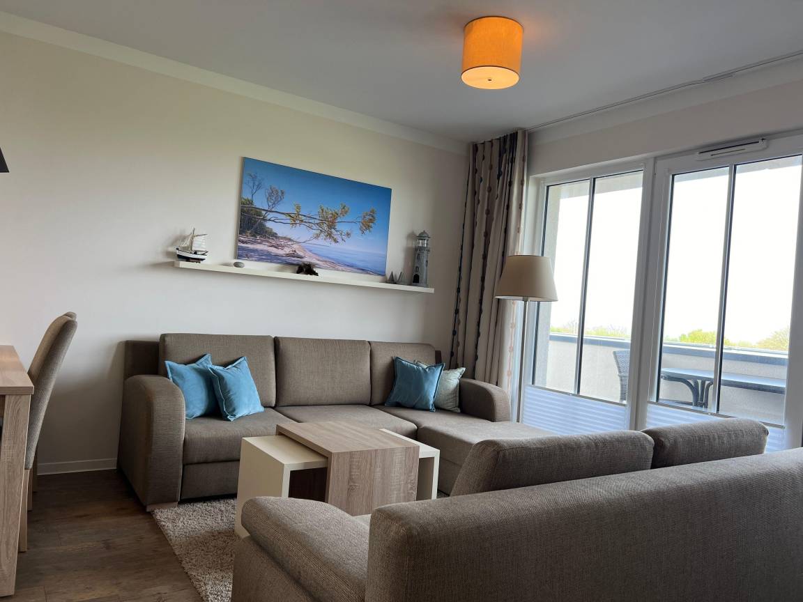Auf dem überdachten Balkon, der zur Meerseite gelegen ist, stehen Ihnen Terrassenmöbel zur Verfügung. Hier können Sie mit Blick auf die Ostsee entspannen.
