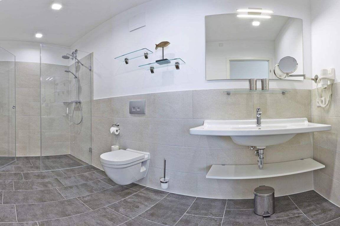 Im geräumigen Bad befinden sich eine großzügige, ebenerdige Regendusche, ein Handtuchtrockner, ein Waschtisch mit Föhn und Kosmetikspiegel.