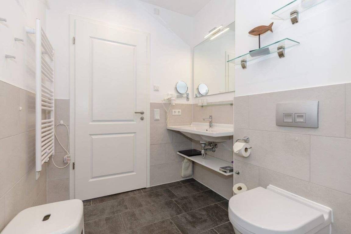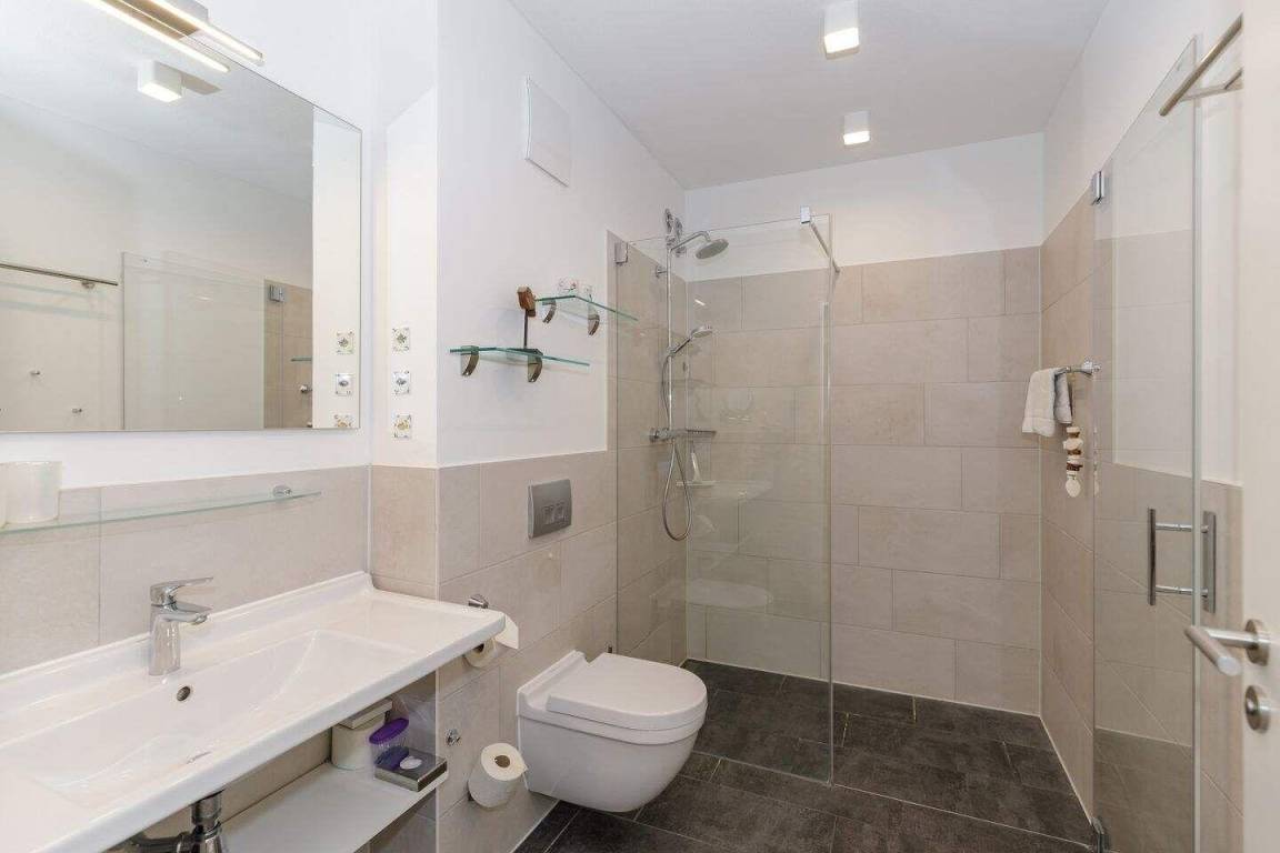Im geräumigen Bad befinden sich eine großzügige, ebenerdige Regendusche, ein Handtuchtrockner, ein Waschtisch mit Föhn und Kosmetikspiegel.