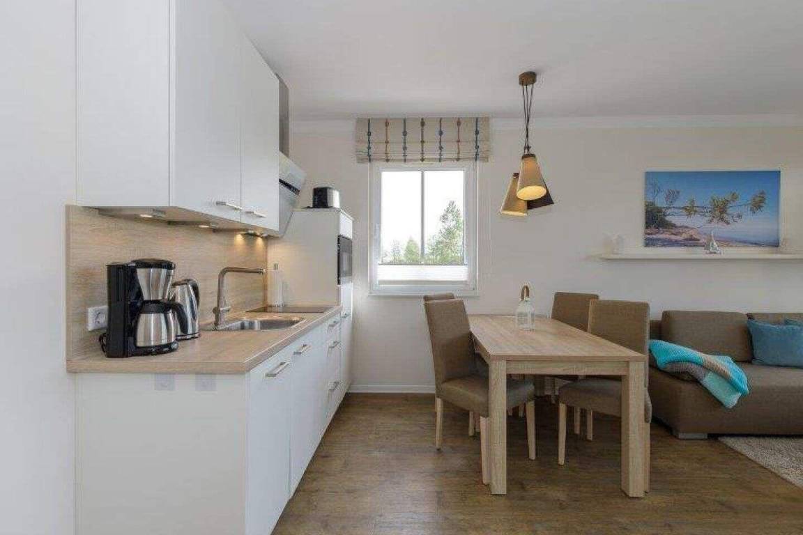 Im kombinierten Wohn-Essbereich befindet sich eine voll ausgestattete Küchenzeile, bequeme Sitzmöbel, ein Esstisch, eine Schlafcouch (140cm x 200cm) sowie ein Flat Screen-TV.