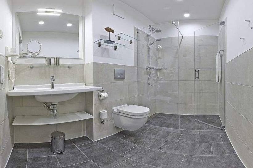 Im geräumigen Bad befinden sich eine großzügige, ebenerdige Regendusche, ein Handtuchtrockner, ein Waschtisch mit Föhn und Kosmetikspiegel.