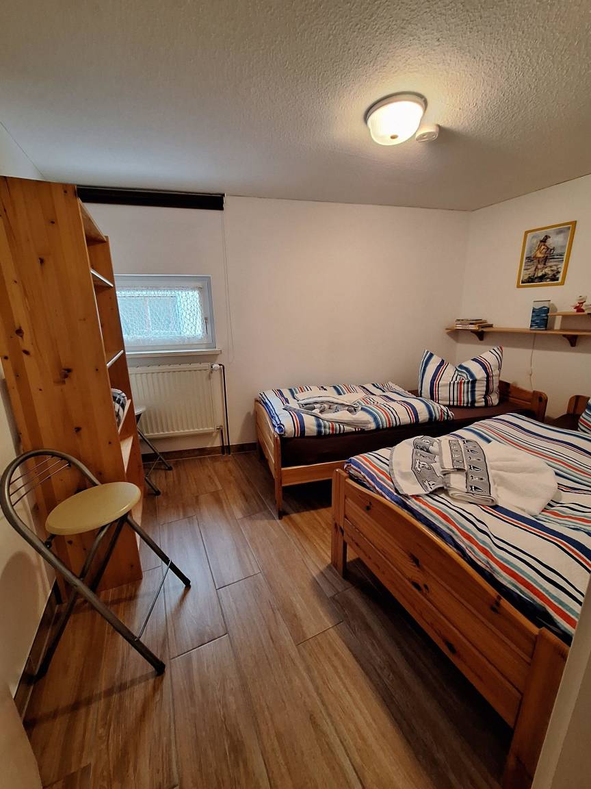 1 Schlafzimmer mit 2 Einzelbetten die auch als Doppelbett zusammen gerückt werden können, einem großen Standregal, bei Bedarf ein Kinderbett, Kinderhochstuhl, Kinderbücher ,