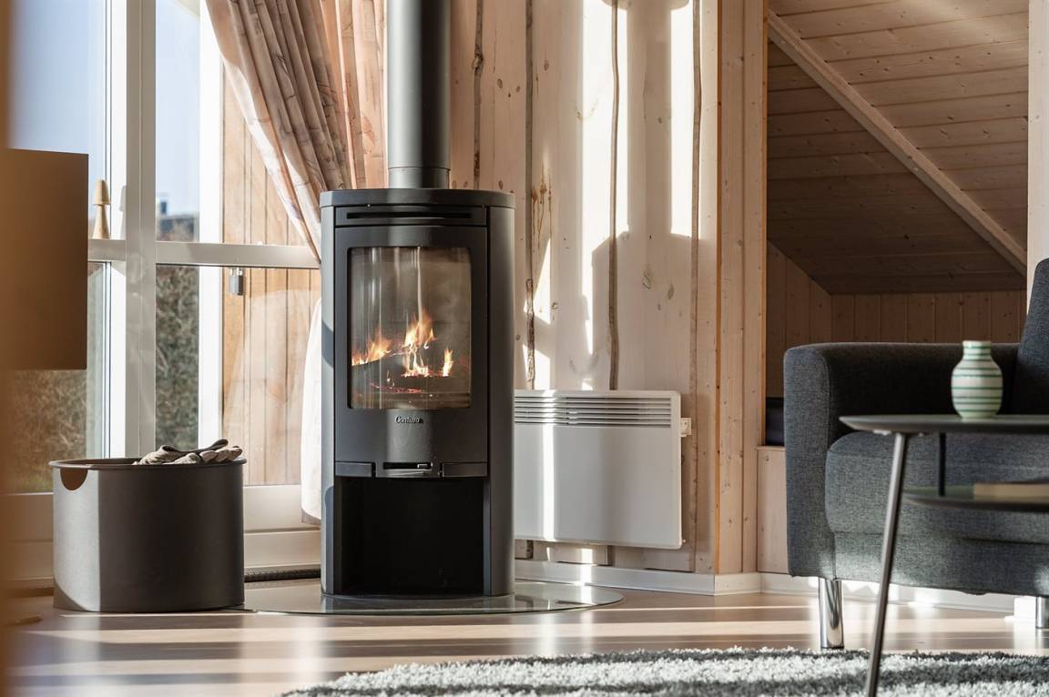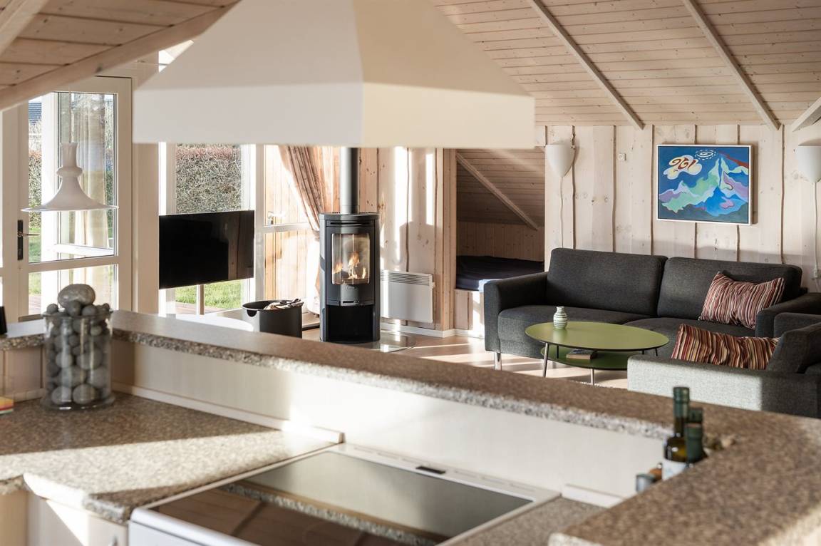 Das Wohnzimmer ist mit modernen Möbeln und einem Kaminofen eingerichtet, welches für eine gemütliche Atmosphäre sorgt. Es gibt zwei schöne Schlafzimmer sowie zwei komplette Badezimmer, von denen eines mit Whirlpool ausgestattet ist und Zugang zu einer schönen Sauna bietet. Hier kann man sich also wunderbar verwöhnen lassen, während man seinen Urlaub genießt.