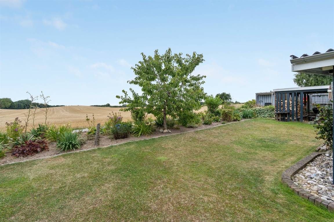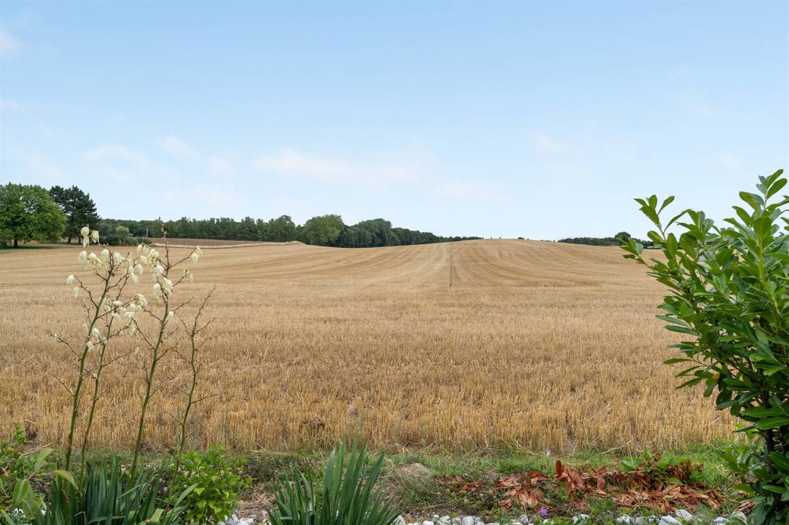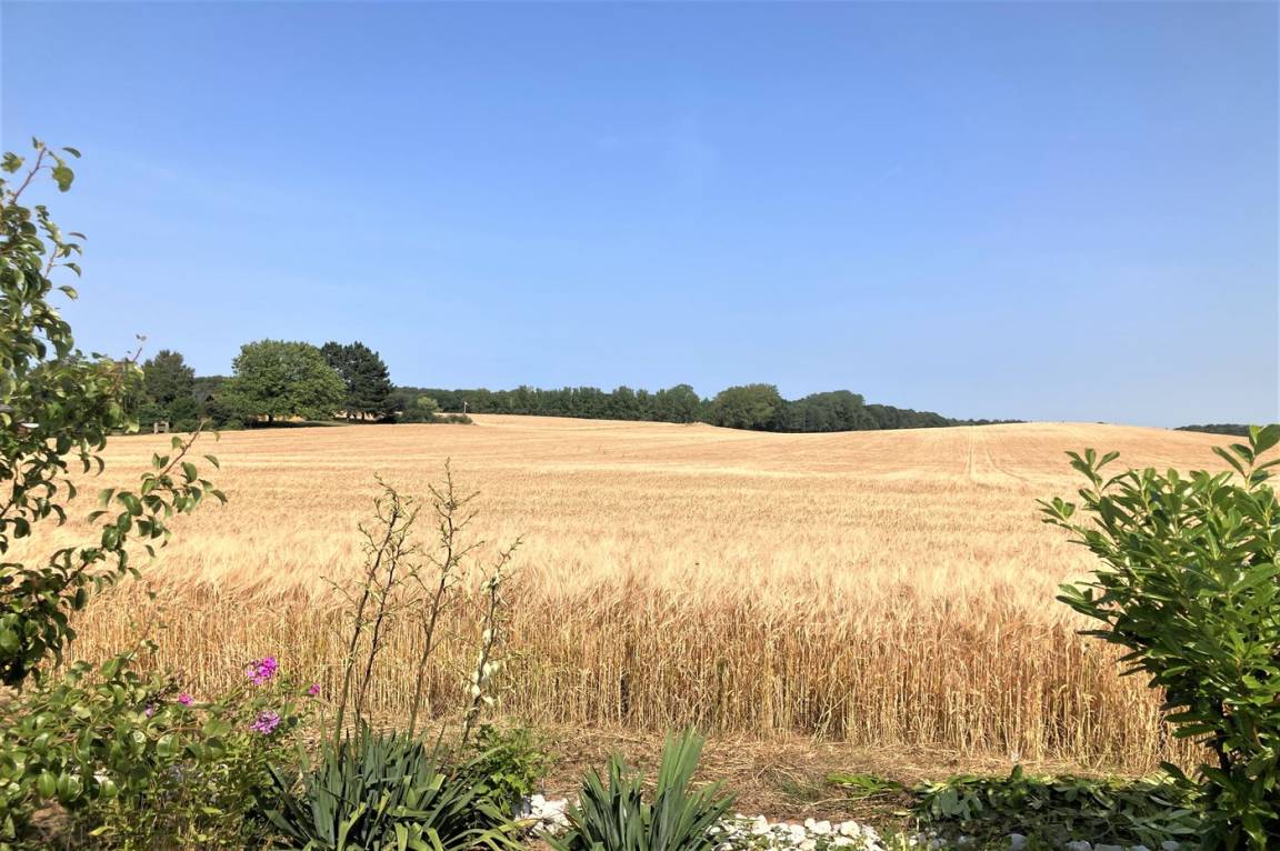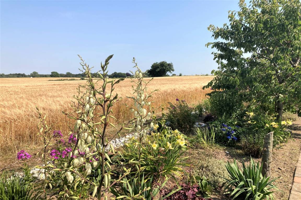Das Haus liegt auf einem Grundstück, das an offene Felder angrenzt mit Ausblick auf die Natur und die Tierwelt.