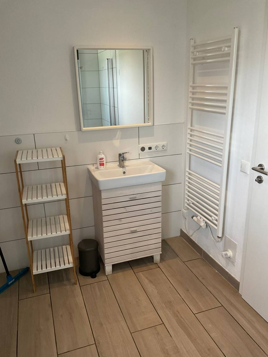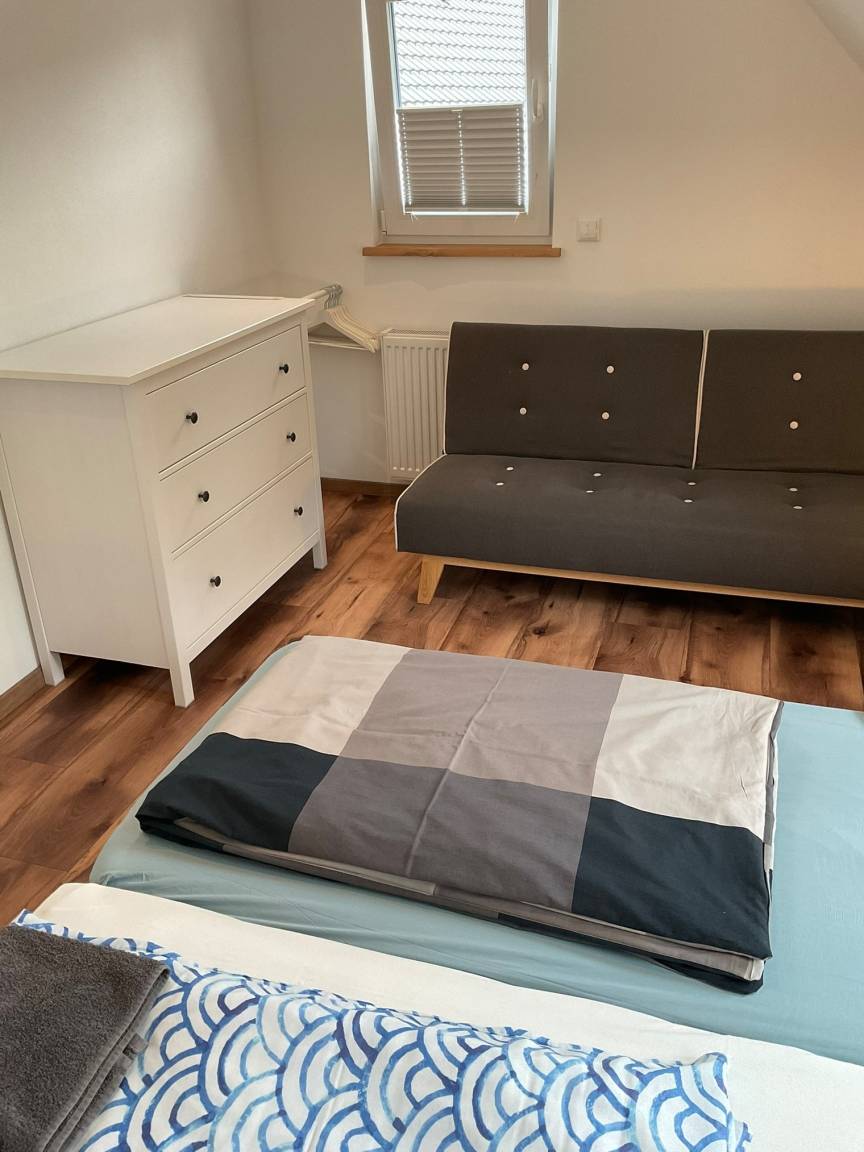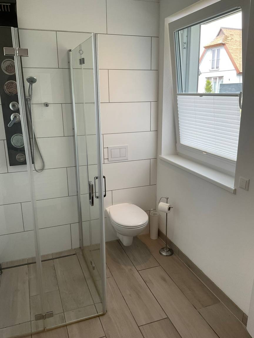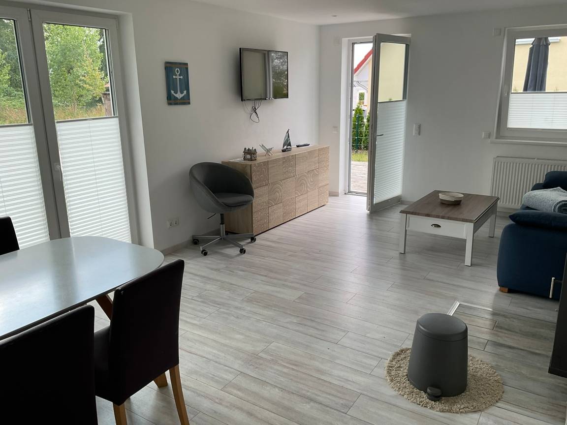 Unsere moderne Ferienwohnung befindet sich im 1. Obergeschoss eines Ferienhauses. Vom Balkon aus genießen Sie den Blick auf die nahe gelegene Ostsee. Aufgeteilt ist die Wohnung in Wohnzimmer mit offener Küche (vollausgestattet), Essbereich, Flat-TV, 2 Schlafzimmer (1. Schlafzimmer mit Doppelbett und TV; 2. Schlafzimmer mit Doppelbett, Badezimmer, offene Küche, Wohnbereich mit Essecke. Eine zusätzliche Terasse im Erdgeschoss mit Garten zur Wohnung ist vorhanden.