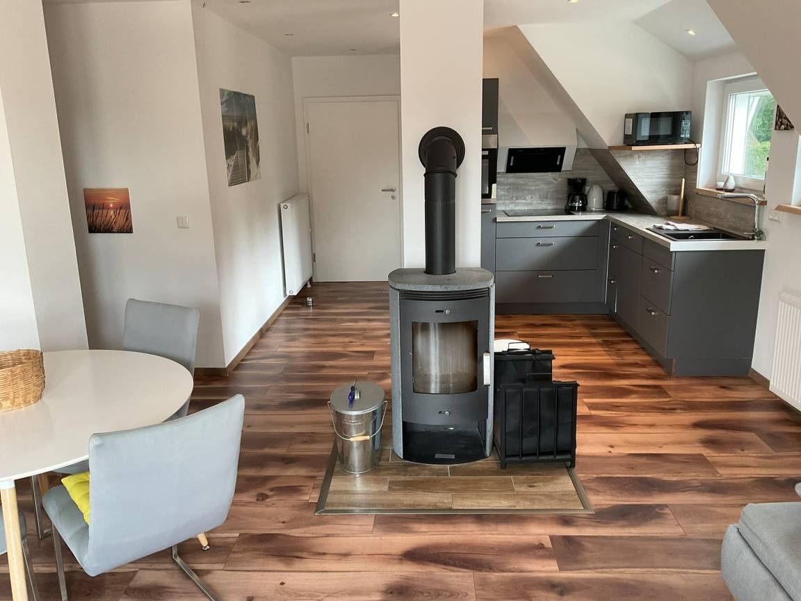 Unsere Ferienwohnung Seeprise liegt im Erdgeschoss, ist barierearm, aufgeteilt in Wohnzimmer mit offener Küche (vollausgestattet), Essbereich, Flat-TV, 2 Schlafzimmer (1. Schlafzimmer mit Doppelbett; 2. Schlafzimmer mit Doppelbett, Badezimmer, offene Küche, Wohnbereich mit Essecke. Sauna und Kamin vorhanden. Eigener Gartenbereich mit Terrasse und Sitzmöglichkeiten. Die Terasse ist auch mit einem Rollstuhl befahrbar. Die Räume lassen sich durch Außenjaloussinen verdunkeln.