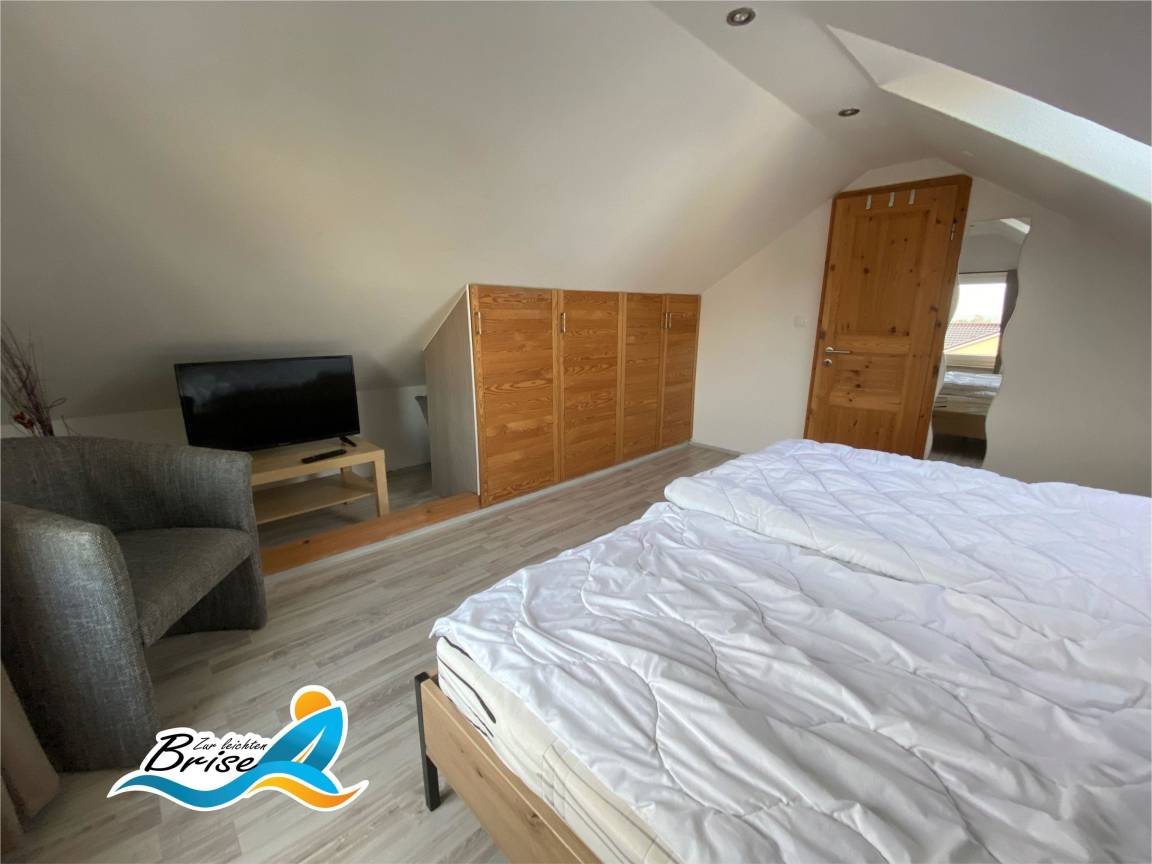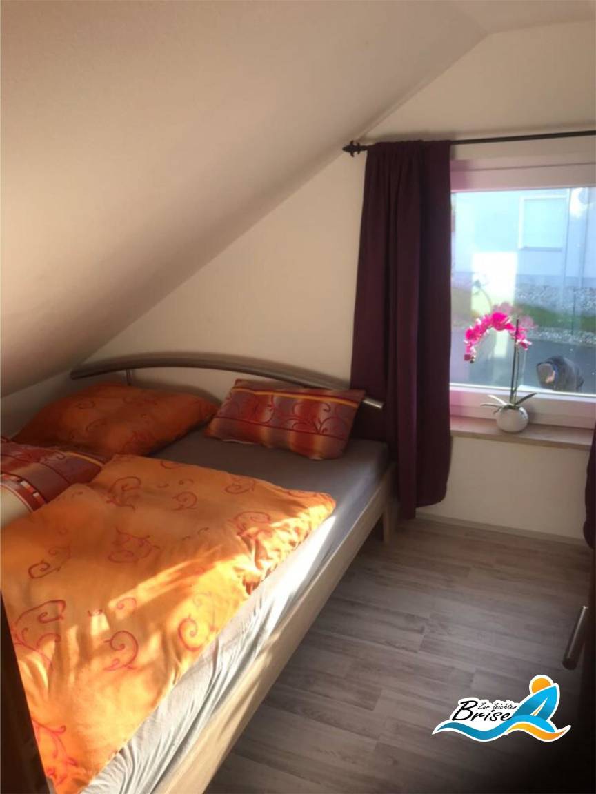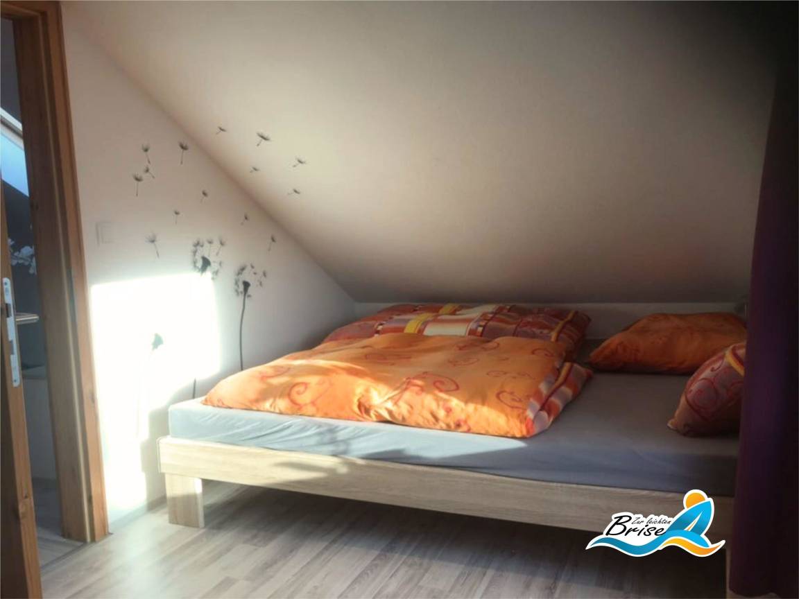 Im Obergeschoss stehen Ihnen 2 Schlafzimmer zur Verfügung. In einem Schlafzimmer steht für Sie ein Doppelbett 1,80x2,00m bereit. Hier bietet Ihnen ein großes Fenster den Blick auf das Salzhaff und die Ostsee mit Ihren Kite Surfern und dem abendlichen Sonnenuntergang am Horizont. Im zweiten Schlafzimmer haben Sie ebenfalls ein Doppelbett 1,80x2,00m. Hier können Sie sich vom Sonnenaufgang wecken lassen. Zur Sicherung des Obergeschosses ist die Treppe mit einem Kindergitter versehen, welches Sie bei Bedarf nutzen können. Außerdem steht ein Kinderbett zur Verfügung.