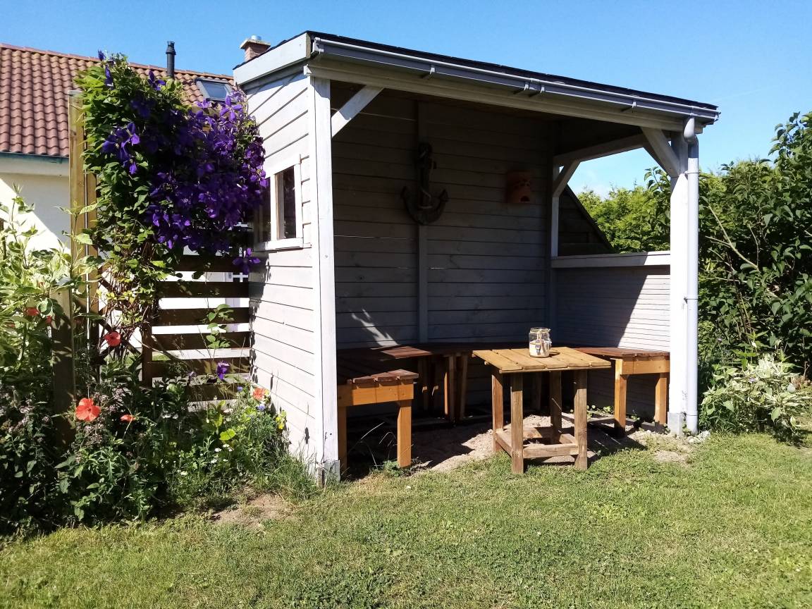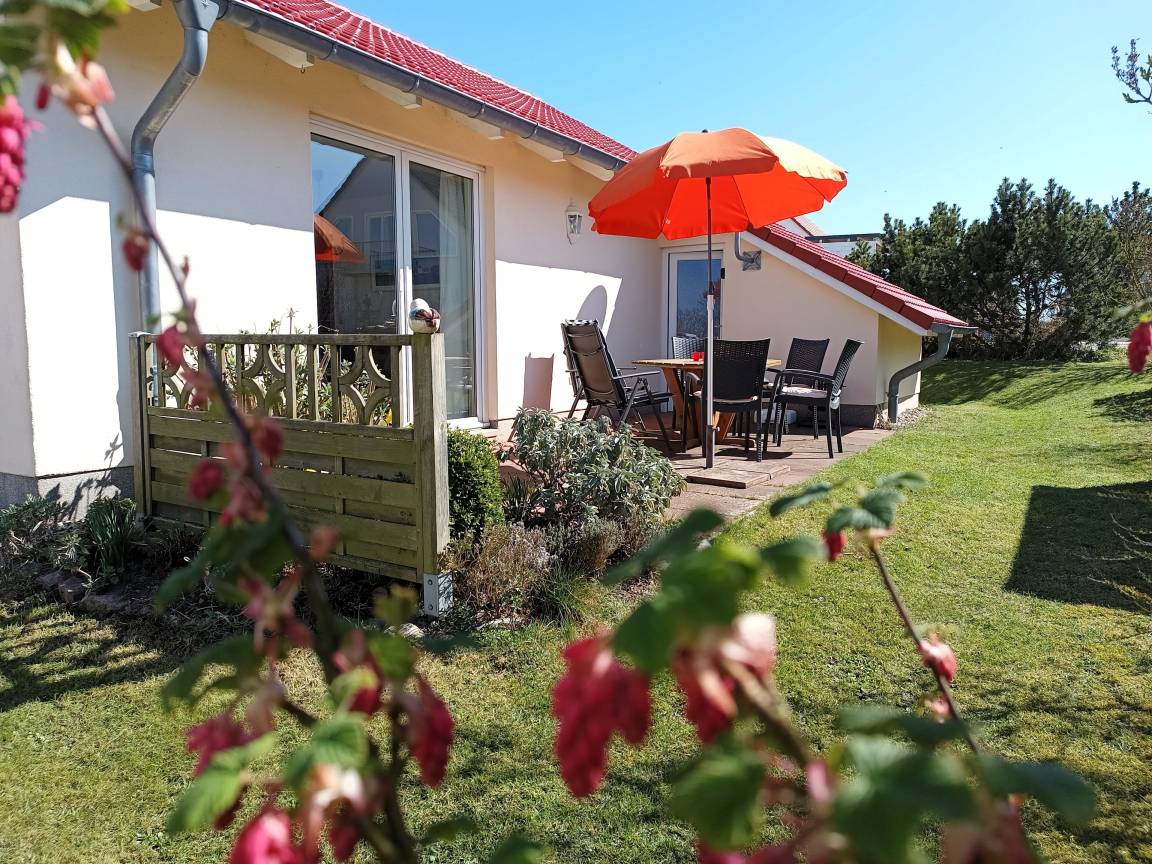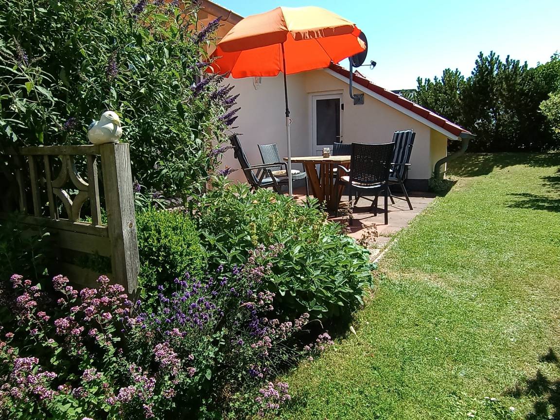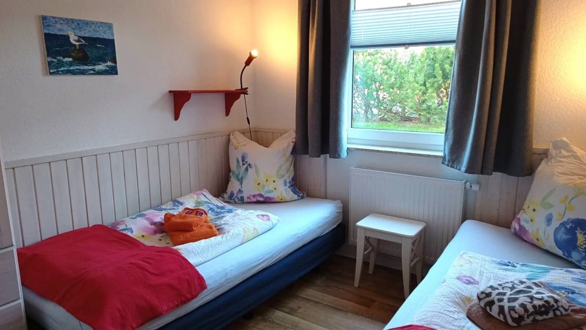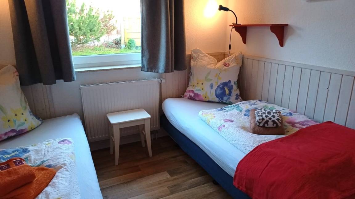 An das Ferienhaus grenzt in Süd-West-Lage die Terrasse an, die durch einen Anbau für Gartenmöbel und Fahrräder sichtgeschützt ist. "Rieke" hat ebenerdig zwei Schlafzimmer, das eine mit bequemen Doppelbett (180x200 m), das zweite mit zwei Einzelbetten (je 90x200m). Der dritte Schlafraum ist ein Schlafboden (über eine Raumspartreppe erreichbar) mit ebenfalls zwei Einzelbetten und einem Spielbereich mit Legosteinen für Kinder.