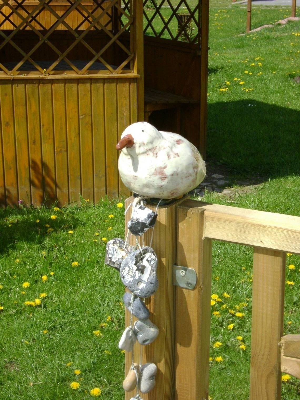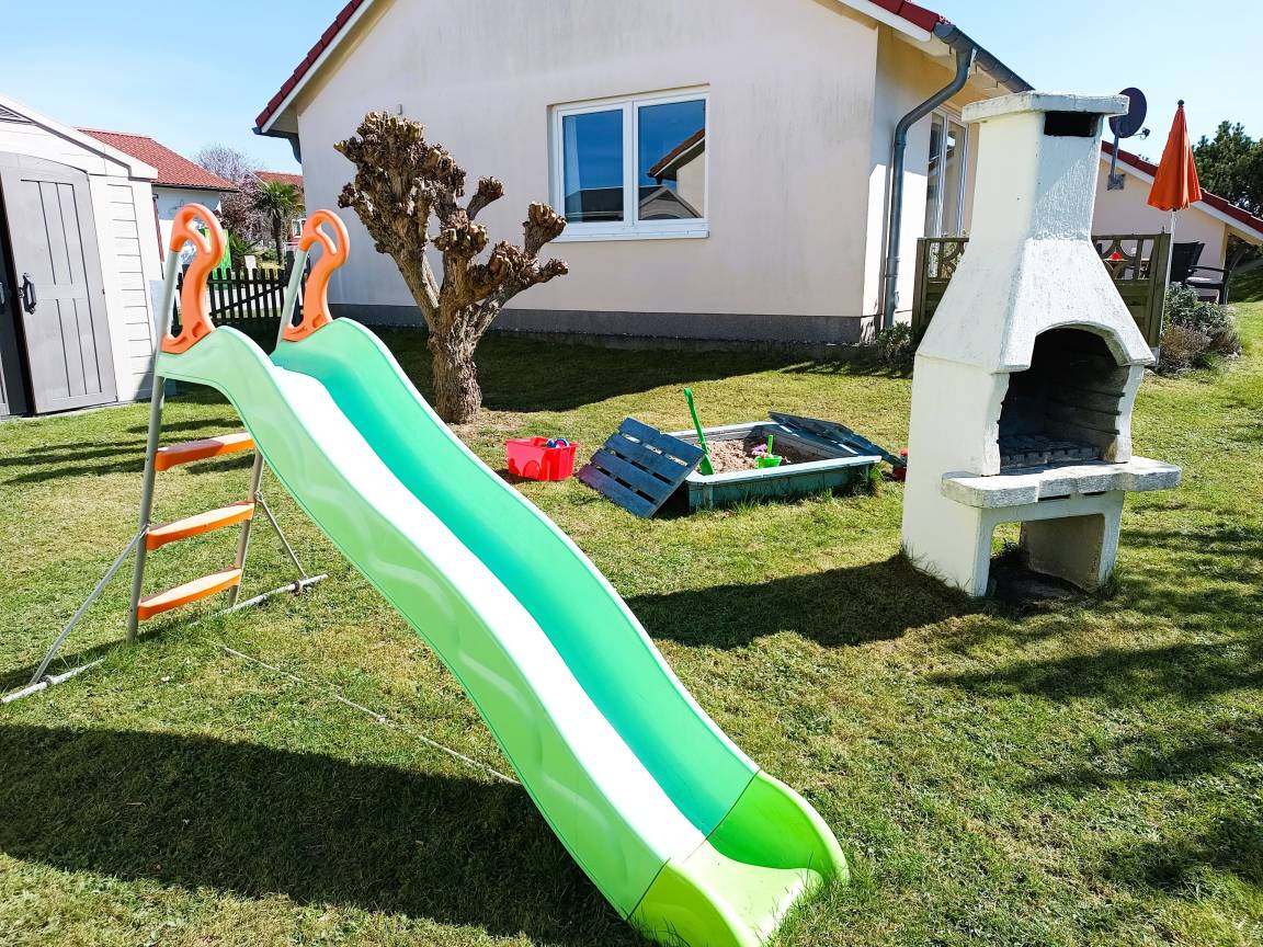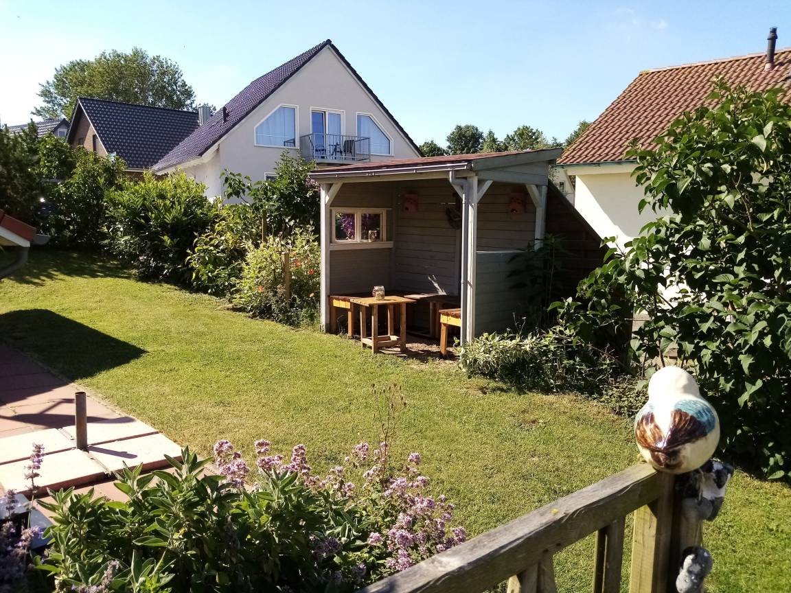 "Rieke" liegt auf einem mit blühenden Sträuchern, Blumeninseln und bunt blühendem Terrassenbeet liebevoll angelegten Grundstück. Es ist nicht eingezäunt. Rasen, Bolzplatz, Kinderrutsche und Sandkiste lassen Kindern viel Platz zum Spielen. Ein hauseigener Grillplatz mit Gartenpavillon rundet das Grundstück ab.