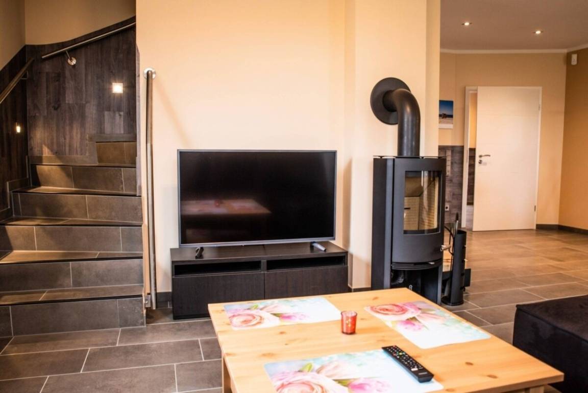 Im Erdgeschoss bildet die große Wohnküche, mit Zugang zur Terrasse, den zentralen Ort des Beisammenseins. Gemeinsam Kochen, vor dem Kamin sitzen und plaudern oder am großen Tisch gemeinsam spielen, alles ist möglich. Des weiteren befinden sich im Erdgeschoss ein Badezimmer sowie ein Schlafzimmer. Im Obergeschoss finden Sie drei weitere Schlafzimmer sowie ein zweites Badezimmer. Für digitale Unterhaltung sorgen WLAN und 2x SAT-TV. Die hauseigene Sauna und der Kamin sorgen für gemütliche Wellness-Abende.