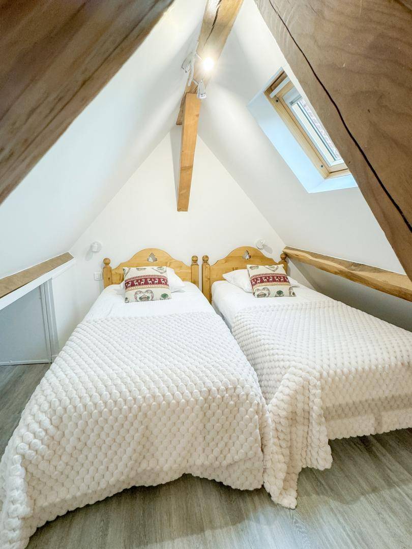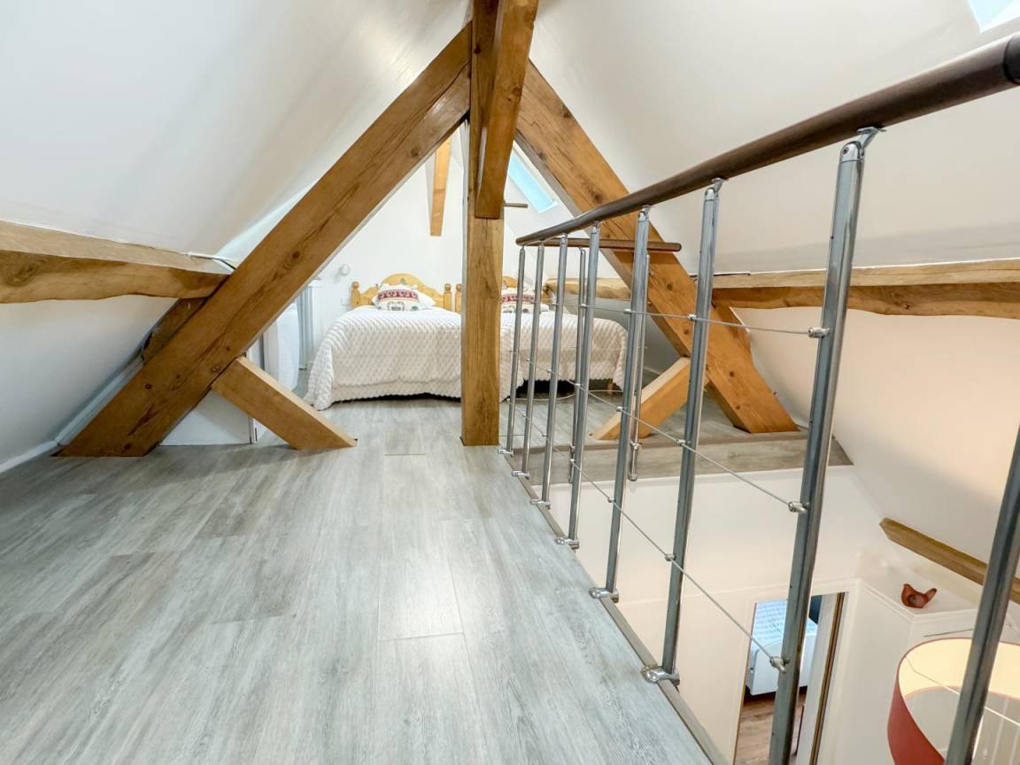 Das kürzlich renovierte Ferienhaus befindet sich im ersten Stock. Es bietet ein komfortables Wohnzimmer mit einem 140 cm breiten Doppelschlafsofa (auf Anfrage für 2 Personen), ein Schlafzimmer mit zwei 90 cm breiten Einzelbetten, ein zweites Schlafzimmer auf einer Galerie (erreichbar über eine Wendeltreppe) mit zwei 90 cm breiten Einzelbetten, die zusammengestellt werden können, ein Esszimmer, eine voll ausgestattete Küche mit Backofen und Waschmaschine sowie ein Badezimmer (mit Badewanne) und WC.