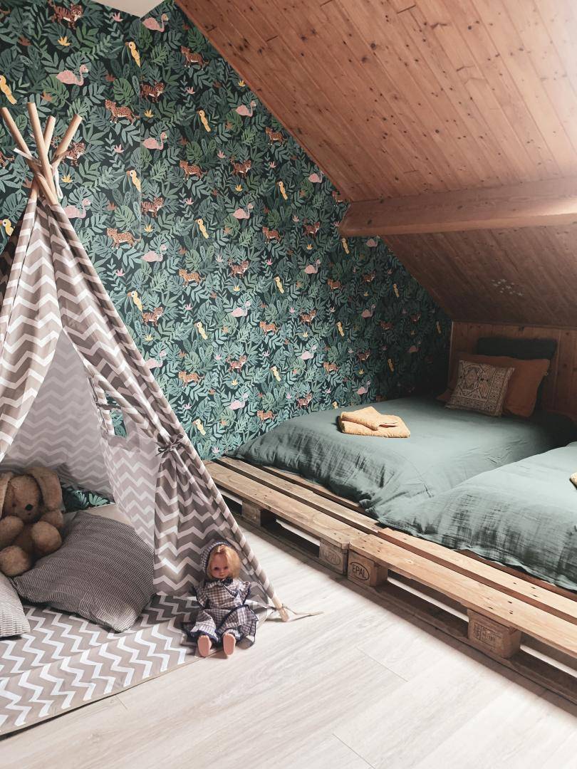 Im zweiten Stock: Ein Schlafzimmer mit zwei Einzelbetten (90 cm), kindgerecht eingerichtet mit Tafel und Spielzelt.