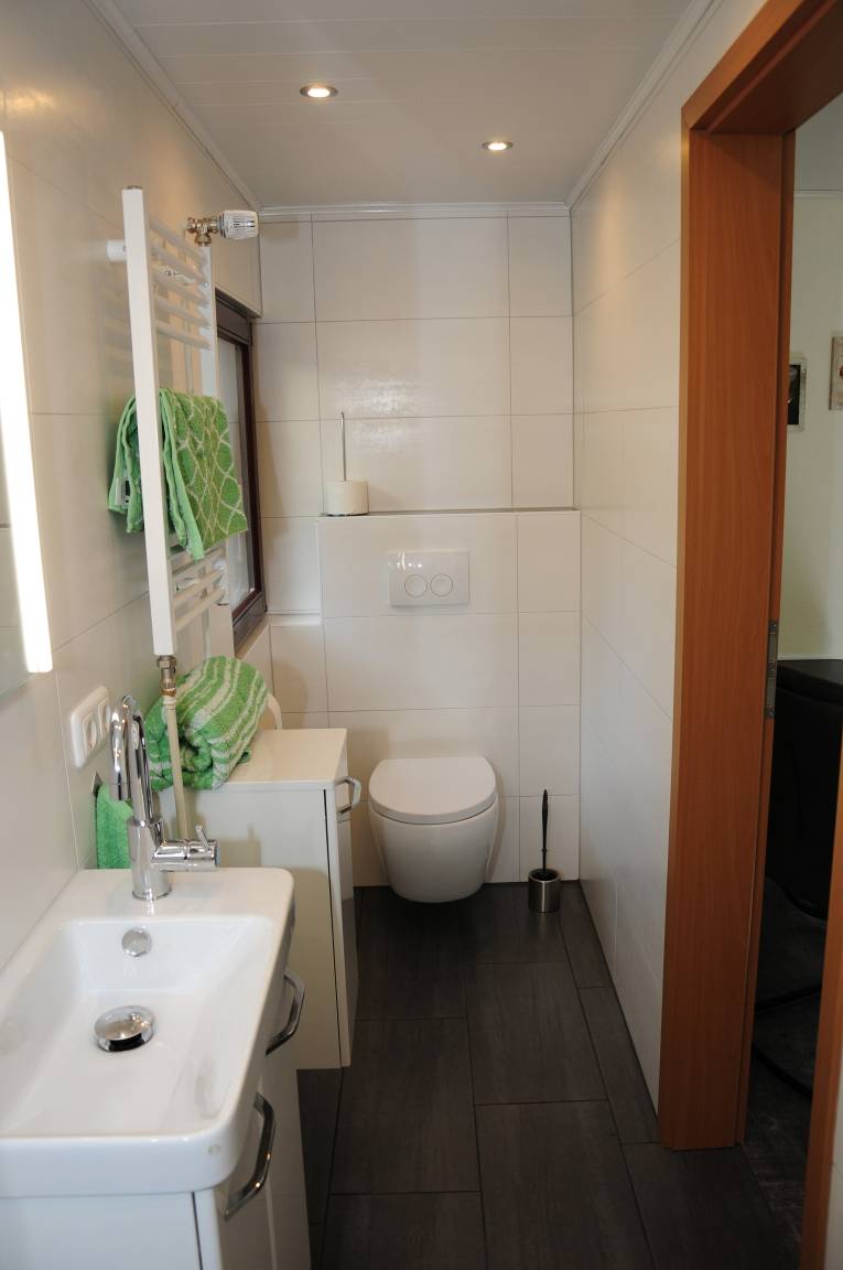 Badezimmer: Modern renoviert mit Dusche, Waschbecken und WC.
