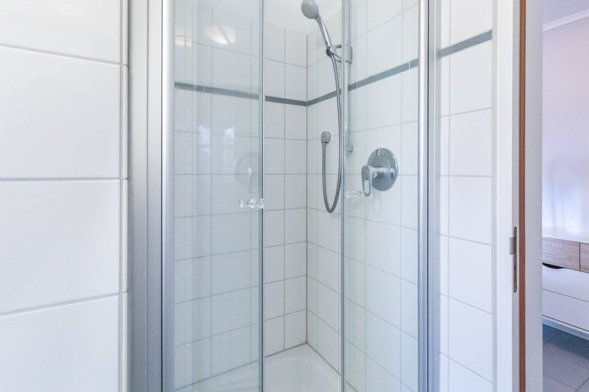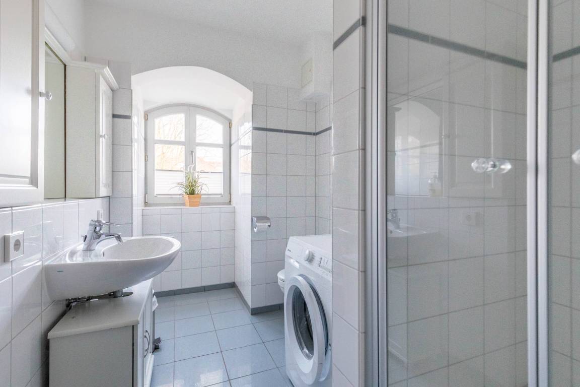 Das Appartement verfügt außerdem über ein helles Badezimmer mit Dusche, WC und kostenfreier Waschmaschine. Das Fenster bietet zusätzlich Tageslicht und hilft beim Lüften.