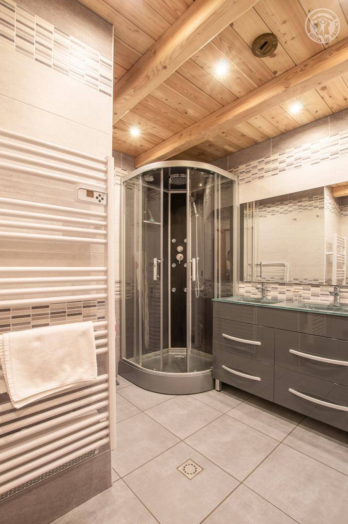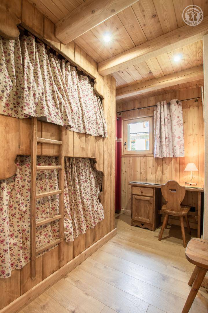 Chalet bestehend aus 3 Gîtes und dem Haus der Besitzer. 1 privater Parkplatz im Winter gepflügt. Wohnung im Erdgeschoss: Zugang von der Rezeption (auf Parkplatz-/Straßenniveau) über eine Treppe, die über 3 Etagen absteigt, dann Wohnung auf einer Ebene. Wohnzimmer-Wohnküche mit Terrasse und Grundstück (gemeinsam), 3 Schlafzimmer (1 Doppelbett 160 x 200 cm / 2 Einzelbetten 80 x 200 cm, die zu 1 Doppelbett 160 x 200 cm kombiniert werden können / 2 Einzelbetten geschlossen 90 x 190 cm Etagenbett), Badezimmer ( Dusche), separates WC. Gemeinsamer Skiraum mit Schuhtrockner.