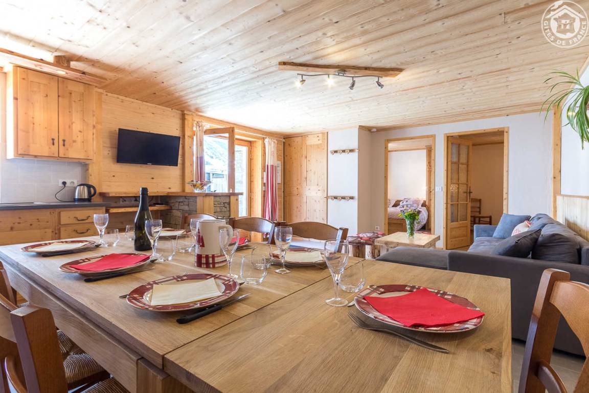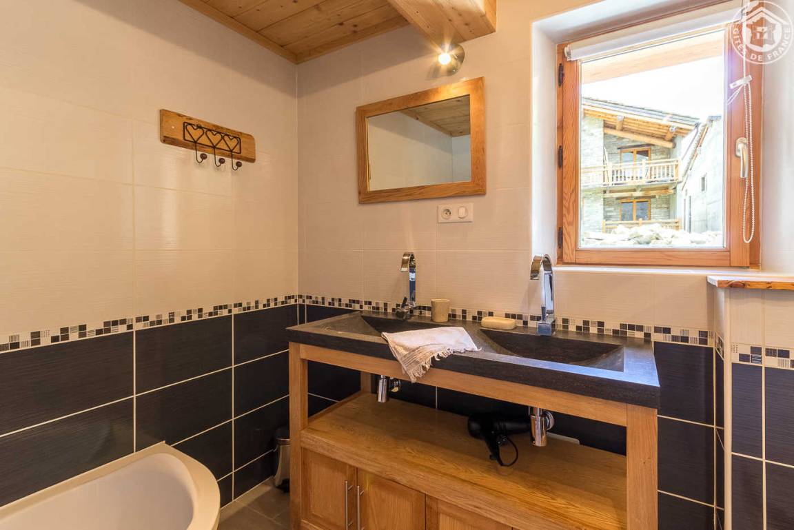 Ferienwohnung im Chalet der Besitzer. Erdgeschoss (unabhängiger Zugang) und auf einer Ebene: Wohnküche mit Sitzecke, WiFi-Anschluss, 1 Schlafzimmer mit Multi-Jet-Dusche und Waschbecken, ohne Öffnung nach außen (1 Doppelbett 140 x 190 cm), 2 Schlafzimmer ( 1 Doppelbett 140 x 190 cm / 1 Doppelbett 160 x 200 cm und ein Einzelbett im Zwischengeschoss mit einer Gesamthöhe von weniger als 1,80 m), Badezimmer (Badewanne, 2 Waschbecken und WC), separates WC . Bettwäsche inbegriffen und Betten bei der Ankunft gemacht. Kiesterrasse. Alpin und Langlauf Bonneval auf 500 m.