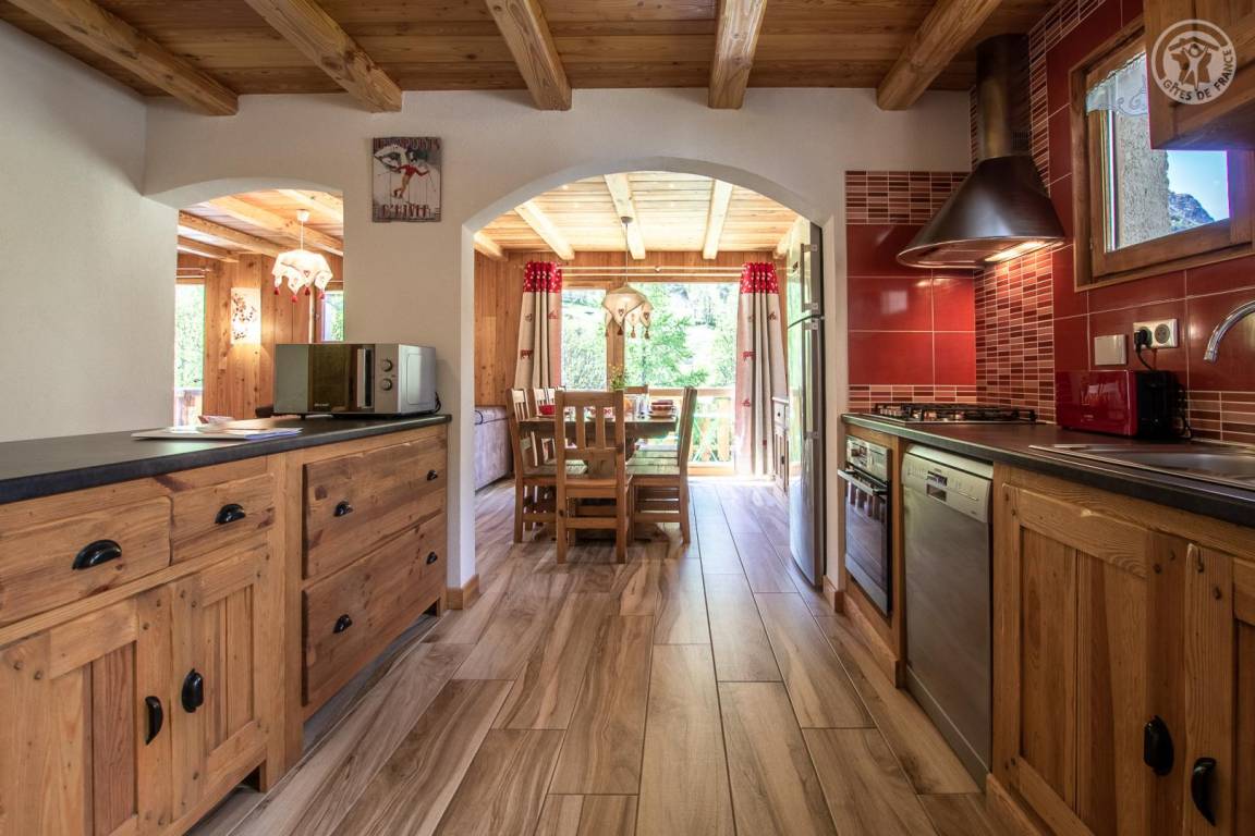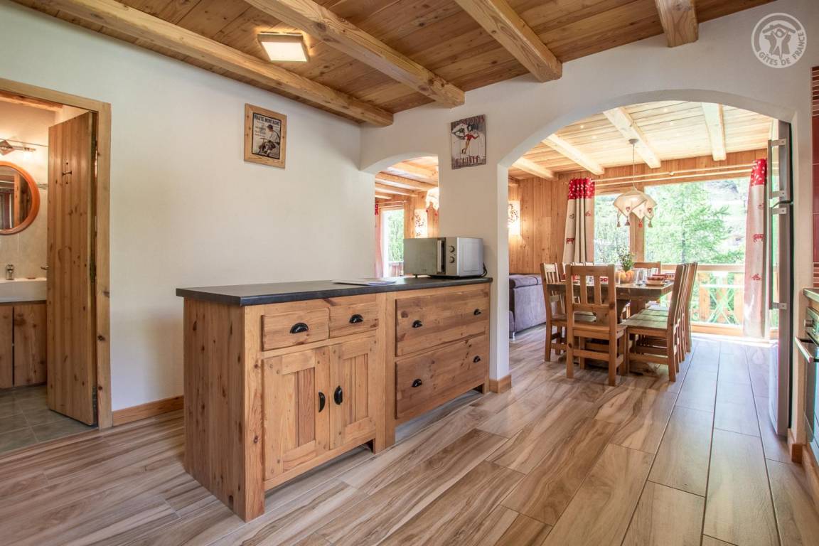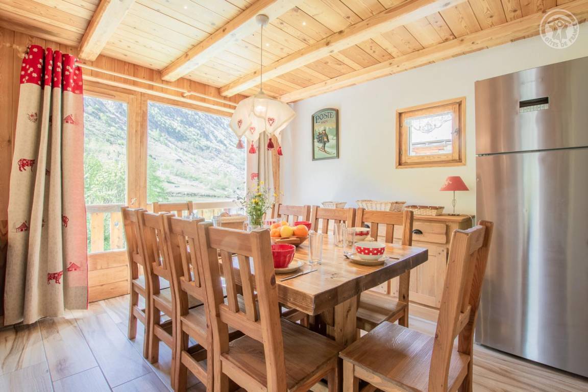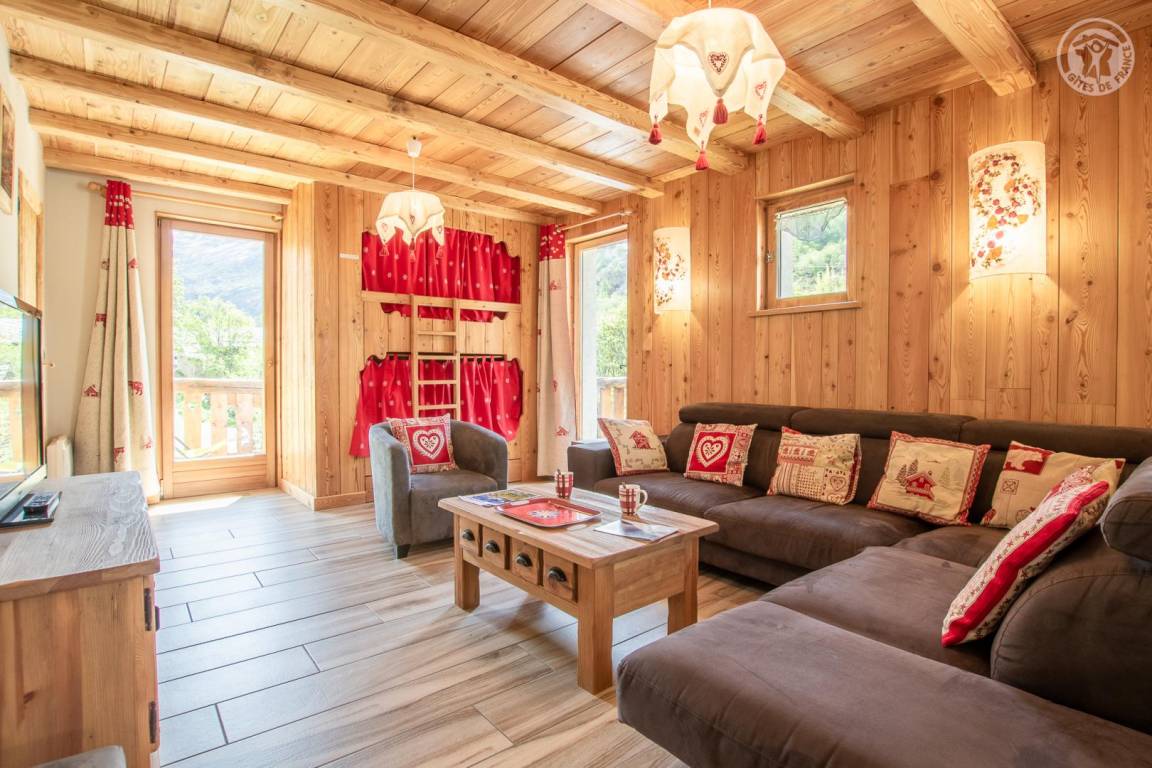 Chalet bestehend aus 3 Gîtes und dem Haus der Besitzer. 1 privater Parkplatz im Winter gepflügt. Wohnung im 2. Stock: Zugang von der Rezeption (auf Parkplatz-/Straßenniveau) über eine absteigende Treppe, dann Maisonette-Wohnung (Treppe mit 10 Stufen zwischen den Schlafzimmern und dem Wohnzimmer). Eingang, 3 Schlafzimmer mit eigenem Bad (Badewanne und WC) und Balkon (2 Einzelbetten 80 x 190 cm, die zu 1 Doppelbett 160 x 190 cm kombiniert werden können / 2 Einzelbetten 80 x 190 cm, die zu 1 Doppelbett 160 x 190 cm kombiniert werden können / 2 Einzelbetten 80 x 190 cm kombinierbar zu 1 Doppelbett 160x190 cm). Untergeschoss: Wohnzimmer-Küche-Wohnbereich (2 geschlossene Betten 90x190 cm) mit Balkon, 1 Schlafzimmer (2 Einzelbetten 80x190 cm, die zu 1 Doppelbett 160x190 cm zusammengestellt werden können) mit Badezimmer (Badewanne und Toilette), 1 Badezimmer ( Dusche und WC) und Balkon. Gemeinsamer Skiraum mit Schuhtrockner.