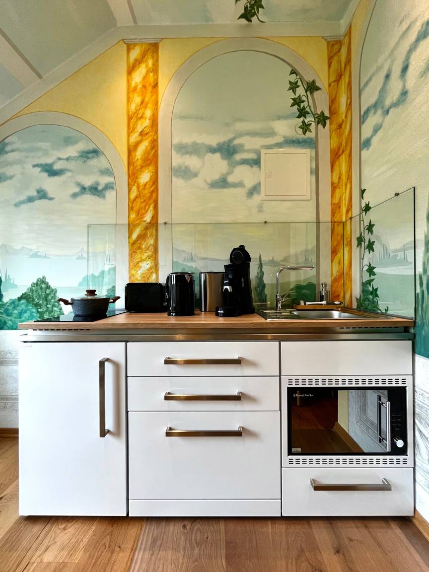 Die PARK VILLA existiert seit 1907 und hat im Laufe ihres Bestehens Zeitgeschichte erlebt und geschrieben. Wir suchten nach einer Möglichkeit, unserer schönen PARK VILLA eine neue Zukunft zu geben. Mit großer Freude dürfen wir Ihnen heute unsere neuen Apartments vorstellen, die von 1 bis 6 Personen buchbar sind. Alle unsere Apartments und Zimmer sind alle liebevoll gestaltet und wir haben unser beliebtes Themenkonzept beibehalten. Die Apartements sind mit kleinen Küchen ausgestattet, sodass unsere Gäste in Zukunft ausschlafen und in Ruhe ihr Frühstück auf ihrem Zimmer zubereiten können. Die neuen Küchen verfügen über einen Kühlschrank, ein Induktionskochfeld, einen Geschirrspüler, eine Mikrowellen/Ofen Kombi und sind mit einer Senseo-Kaffeemaschine, einem Toaster und einem Wasserkocher und Geschirr ausgestattet. Bei den Renovierungsarbeiten haben wir darauf geachtet, dass der in unserer Villa so geschätzte Stil erhalten bleibt.