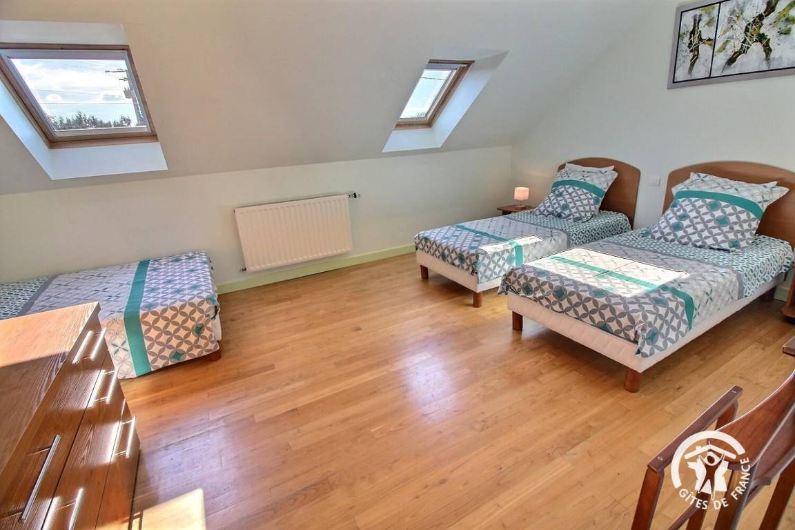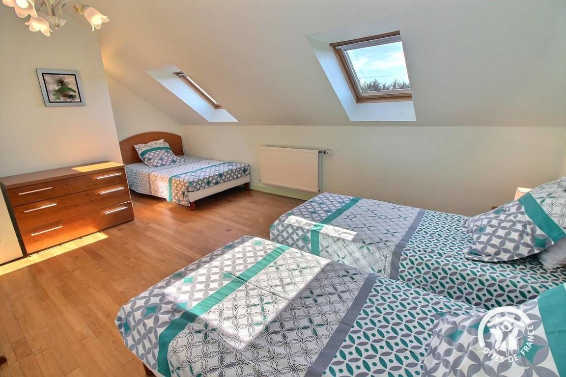• Ein Schlafzimmer mit einem Bett (120 x 190 cm) und zwei Betten (90 x 190 cm)